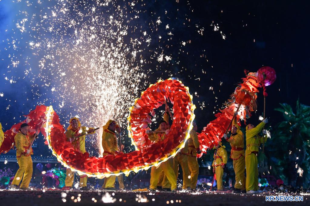 4일 저녁 타이장(台江)현에서 열린 먀오족 전통 대보름맞이 행사에서 참가자들이 불꽃 속에서 용춤을 선보이고 있다.