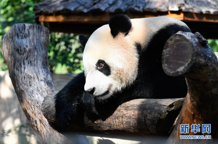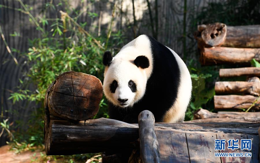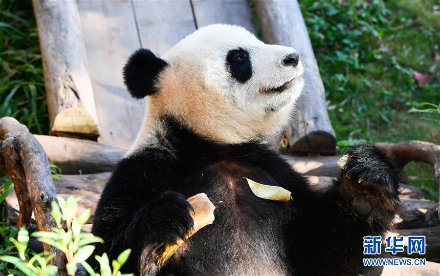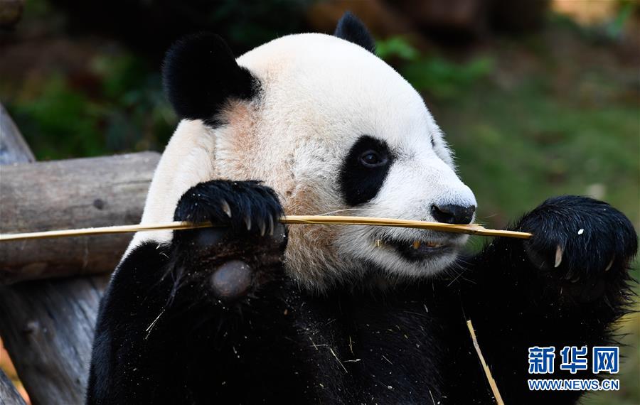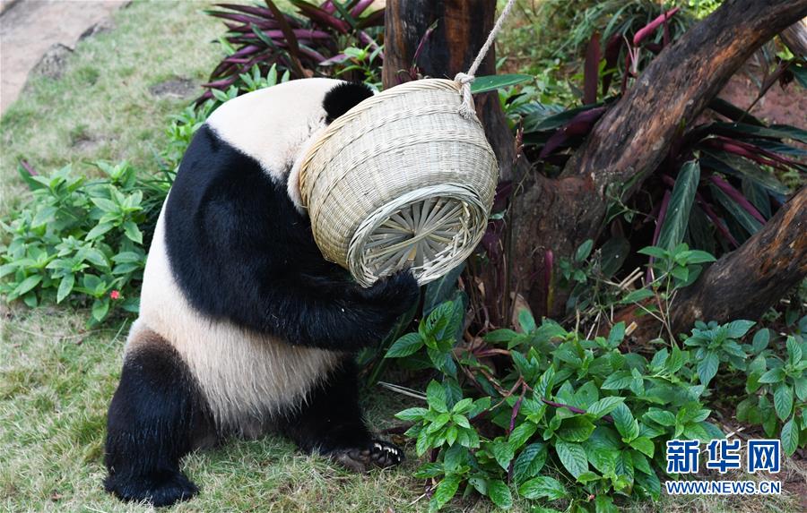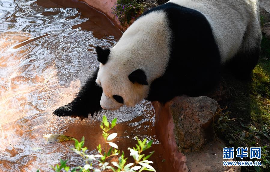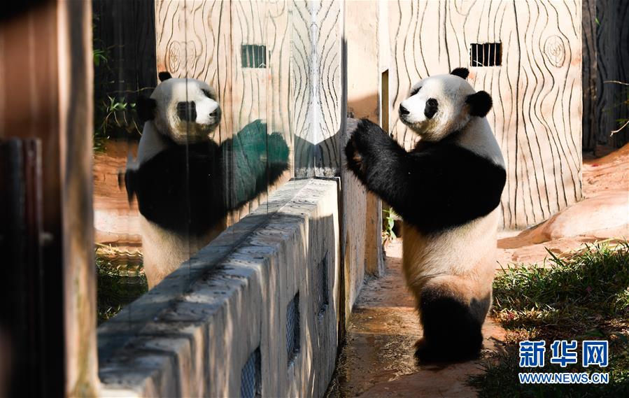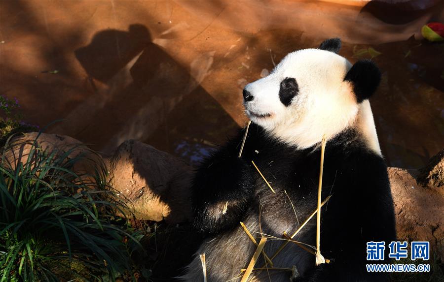 하이난(海南) 열대야생동식물원에 사는 판다 궁궁(貢貢)과 순순(舜舜)이 항온항습실에서 나와 먹이를 먹고 놀면서 겨울의 따스한 햇살을 만끽하고 있다. 동식물원 직원의 소개에 따르면 날씨가 추워지면서 궁궁과 순순은 바깥으로 나오는 걸 더욱 좋아한다며 하루에 보통 6-7시간 정도 실외에서 활동한다고 전했다. [촬영/신화사 기자 양관위(楊冠宇)]