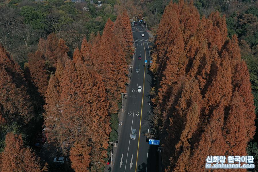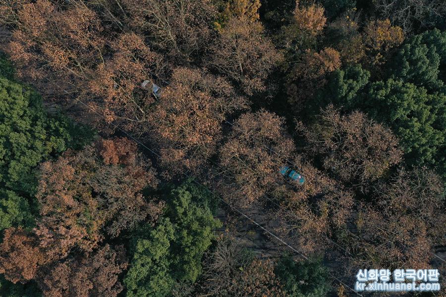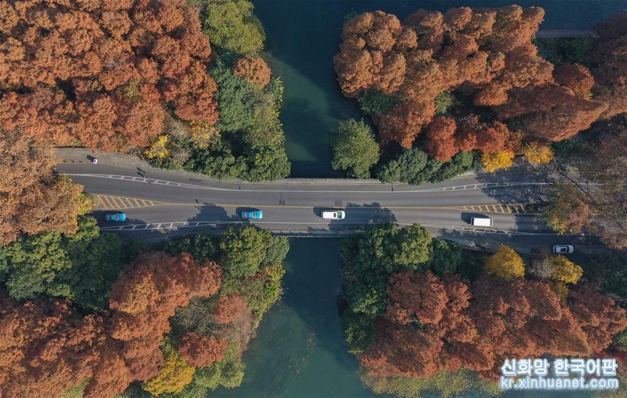 12월13일, 자동차가 항저우 시후 관광지의 후파오루를 주행하고 있다.(드론 촬영)