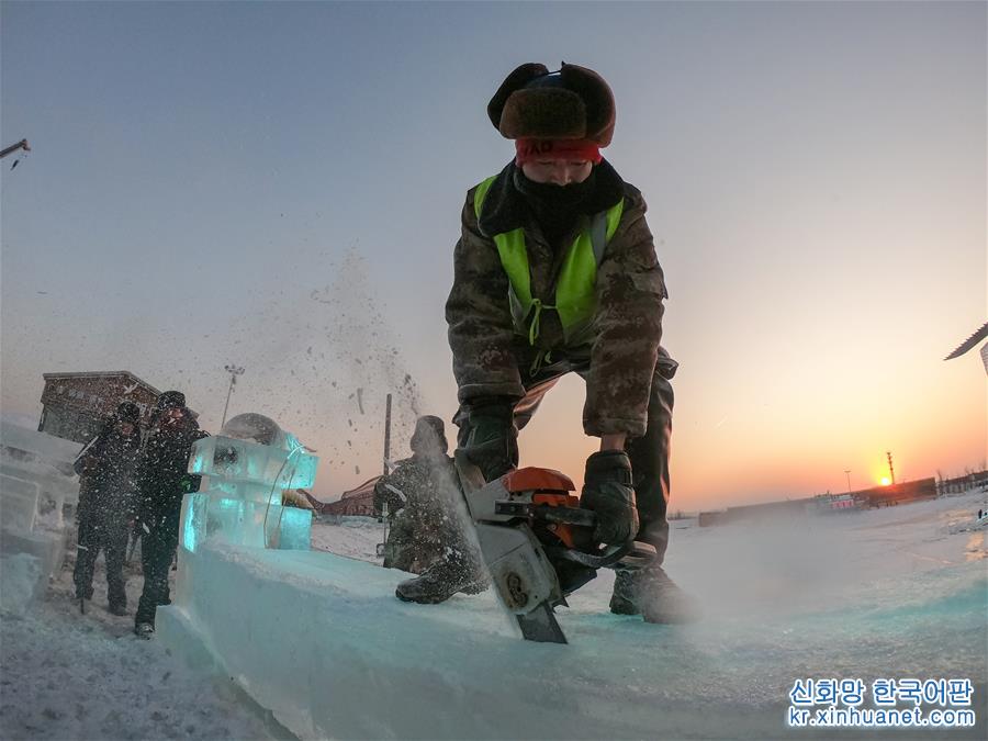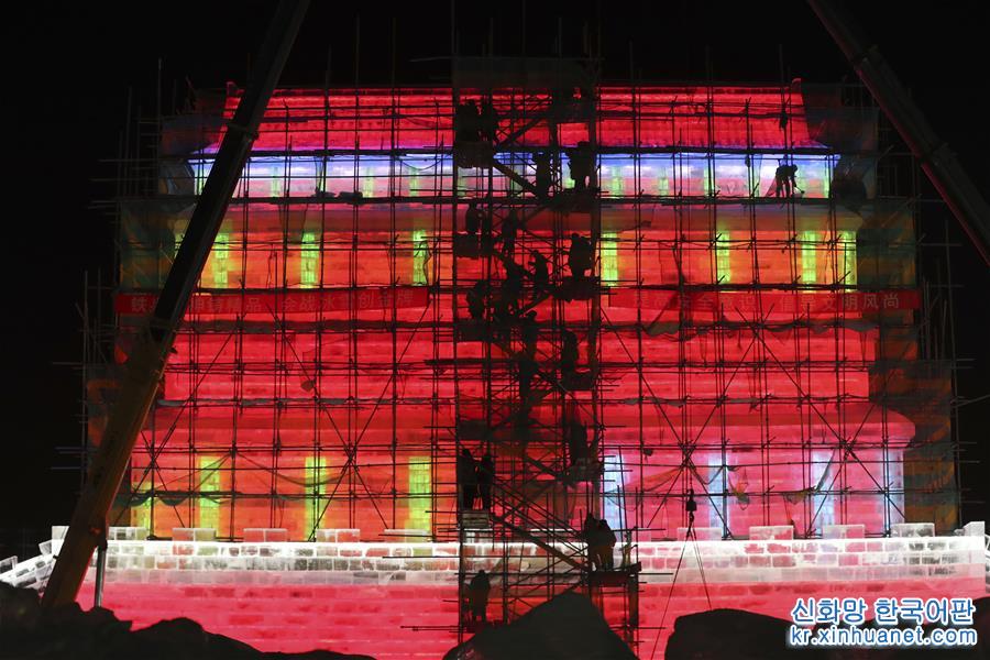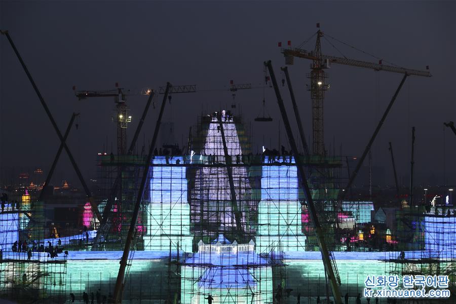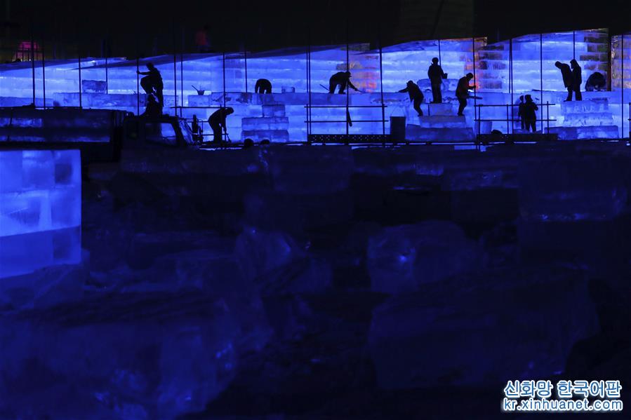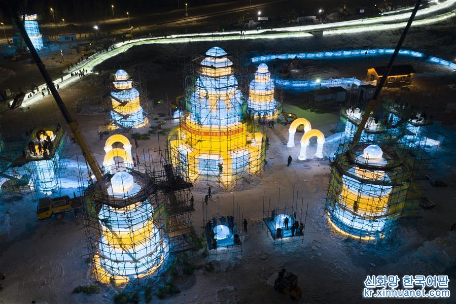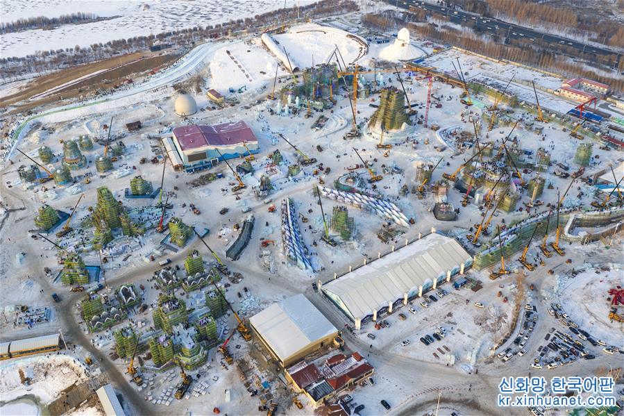 공사 중인 제21회 하얼빈(哈爾濱) 빙설랜드 전시 구역(12월 15일 드론 촬영). 최근, ‘빙설공융(冰雪共融)·환락동행(歡樂同行)’을 주제로 한 제21회 하얼빈 빙설랜드 전시 구역이 공사에 박차를 가했다. 이번 빙설랜드 행사 부지면적은 60만m2이고 20여만m3에 달하는 빙설로 하나의 ‘빙설 드림웍스’를 만들어낼 예정이다. [촬영/ 셰젠페이(謝劍飛)]