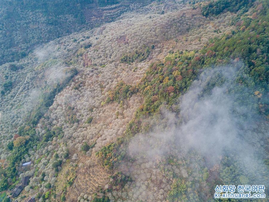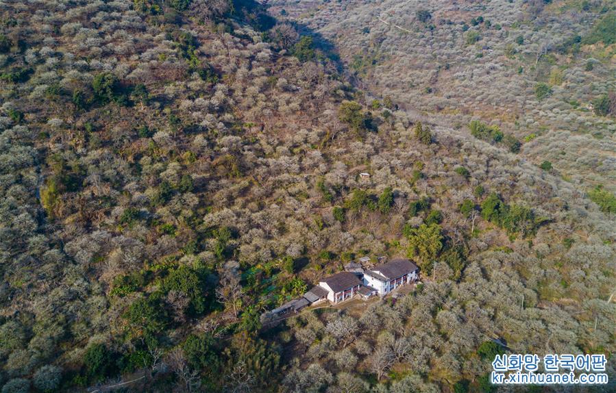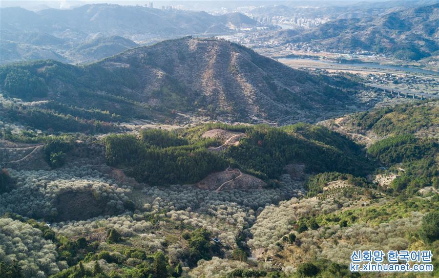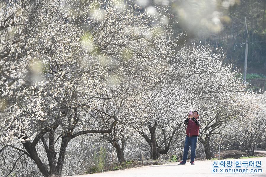 1월 2일, 한 남성이 푸젠(福建)성 푸저우(福州)시 융타이(永泰)현 거링(葛嶺)진 시양(溪洋)촌에서 꽃구경 하며 사진을 찍고 있다. 최근, 푸젠성 푸저우시 융타이현 경내의 수 만 묘 청매가 잇따라 꽃이 피며 온 천지에 새하얀 눈이 덮인 듯한 절경을 사람들 눈앞에 펼쳐주었다. [촬영/ 신화사 기자 쑹웨이웨이(宋為偉)]