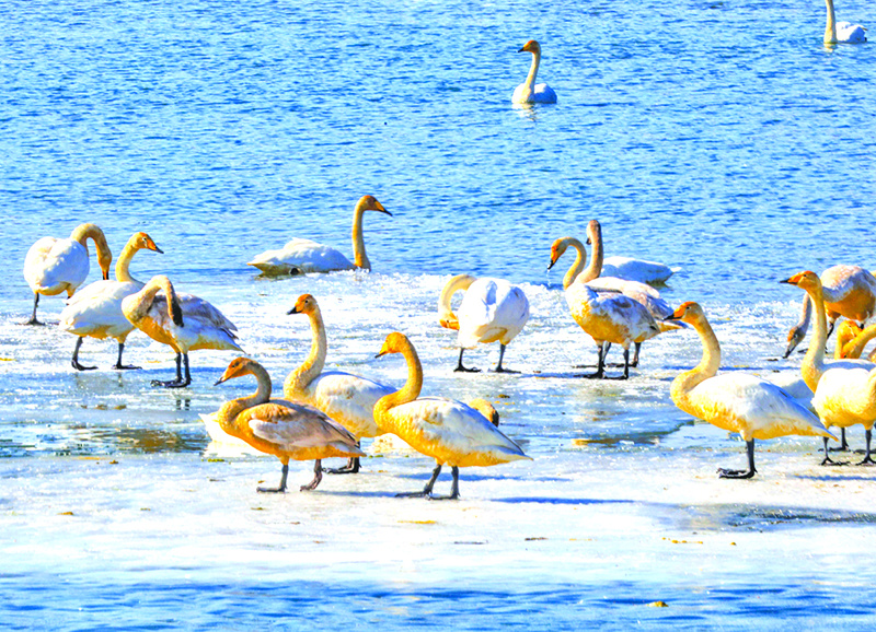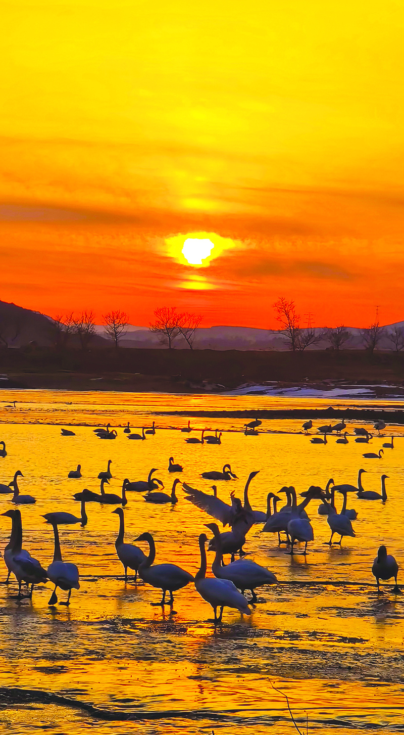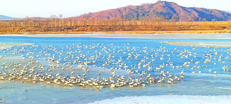 련일 봉성시 란기진 홍토지촌 매가보 대양하 수역에서 백조 떼가 때로는 물속에서 노닐고 때로는 날개를 치며 높이 날아 오른다. 우렁찬 울음소리가 여기저기서 울려퍼져 초봄의 대지에 생기와 활력을 더해 주고 있다.