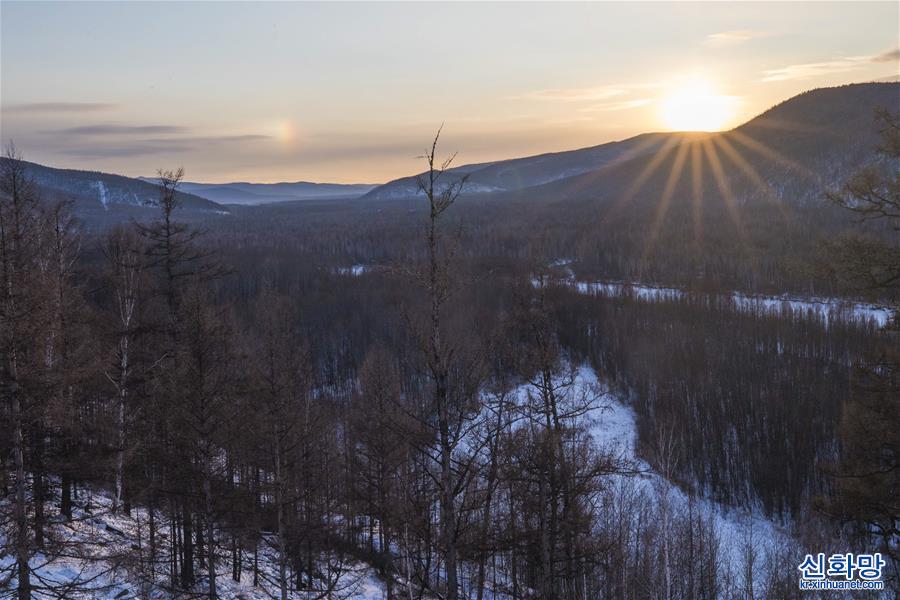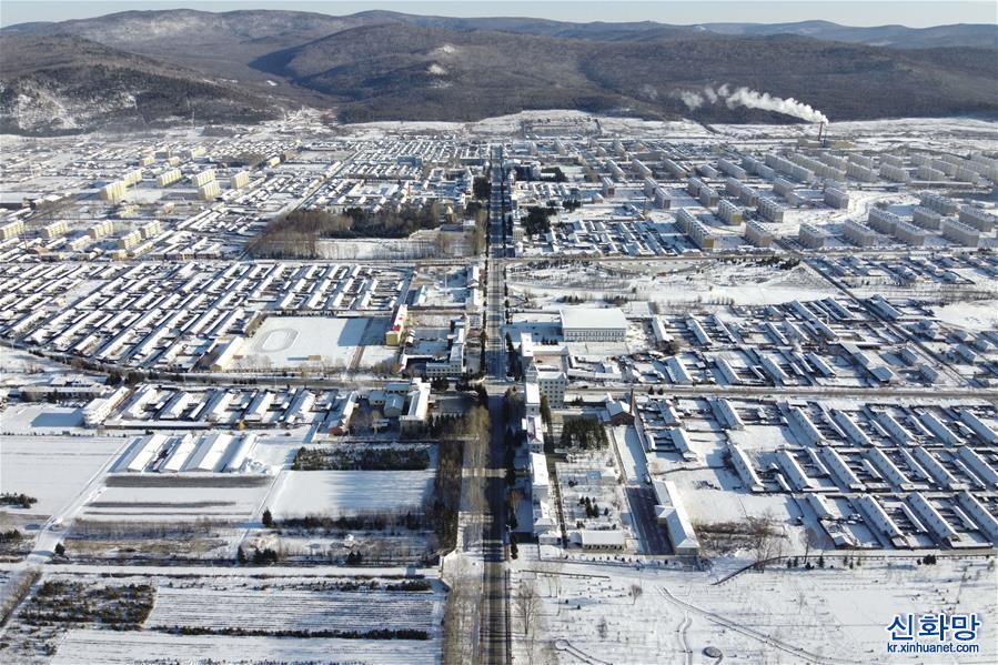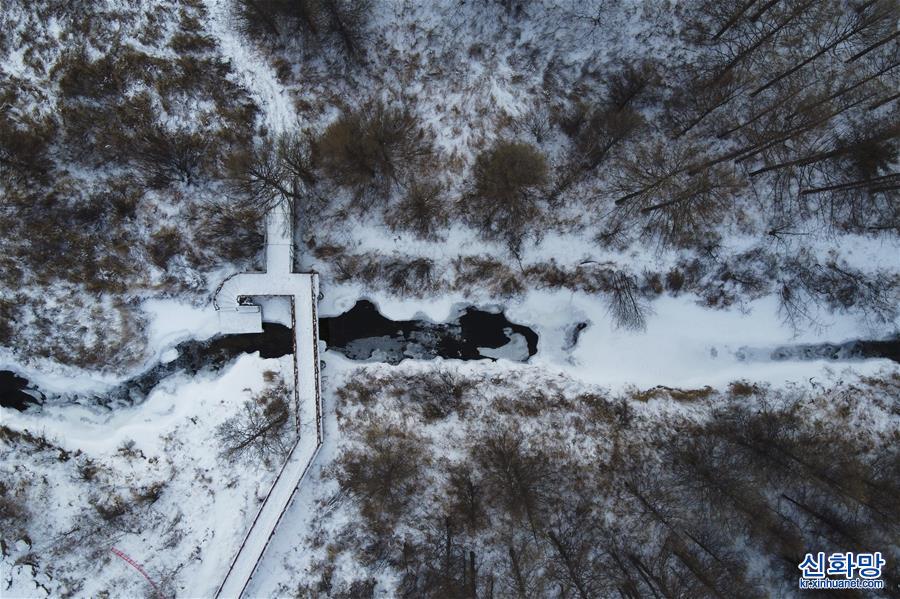 후중(呼中)구 비수이베이(碧水北) 동굴 유적 관광지 안의 얼지 않는 강이 숲 속을 흐르고 있다. (1월12일 촬영, 드론 사진) 헤이룽장성 다싱 안링 이러후리산 북쪽 기슭에 위치한 후중구의 연 평균 기온은 -4.3℃이다. 사상 최저 기온은 -53.2℃에 달해 ‘중국에서 가장 추운 마을’로 불린다. [촬영/장타오(張濤)]