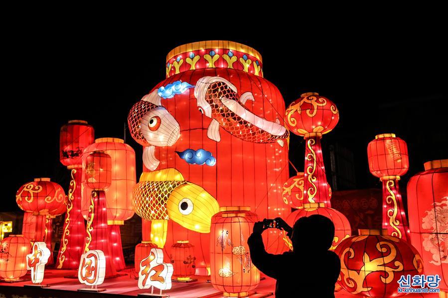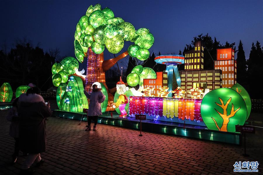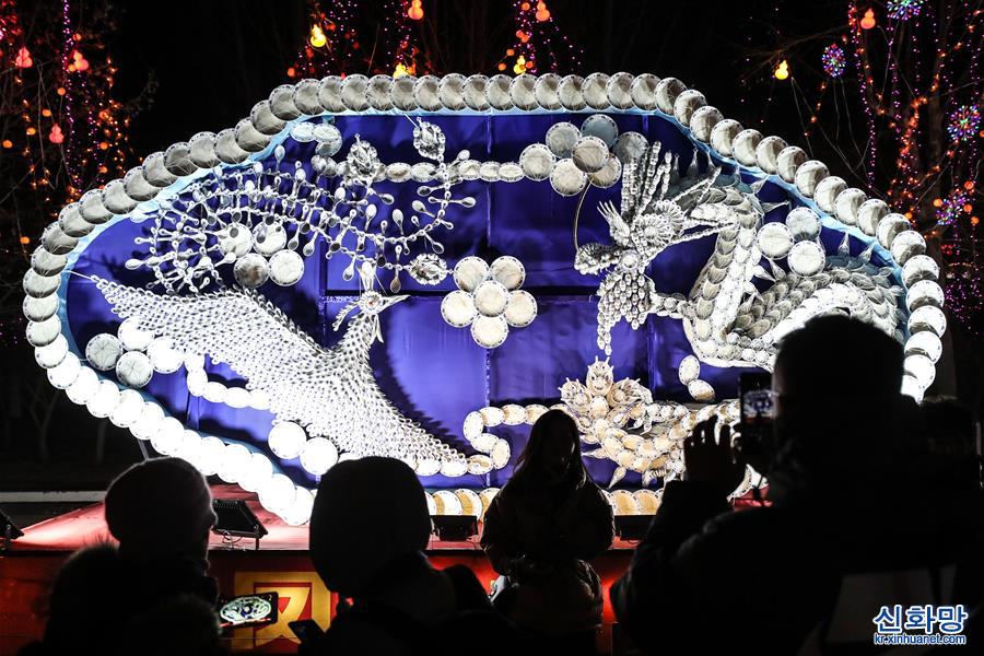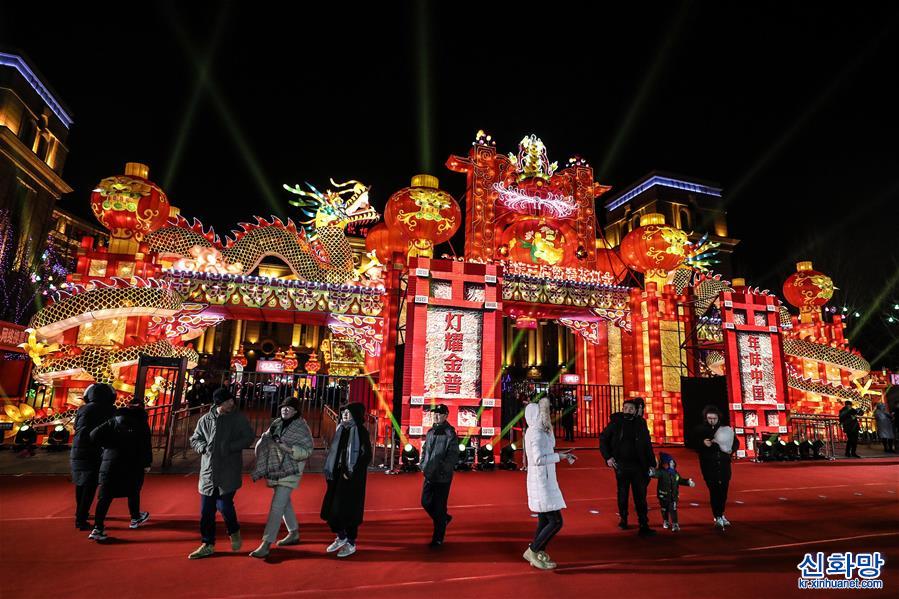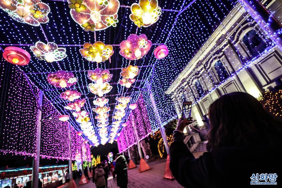 1월 17일, 유람객이 새해 꽃등대회에서 유람하고 있다. 2020년 진스탄(金石灘) 제3회 새해 꽃등대회가 이날 저녁 랴오닝(遼寧)성 다롄(大連)시 진스탄 국가관광휴양지 진스문화박람광장에서 개막했다. 이번 꽃등대회에 전시된 꽃등은 쓰촨(四川) 쯔궁(自貢)의 전문 장식등 업체가 두 달에 걸쳐 제작, 5대 주제에 총 80여 세트의 대형 장식등으로 구성되었다. 꽃등대회는 2월 23일까지 지속될 예정이다. [촬영/ 신화사 기자 판위룽(潘昱龍)]