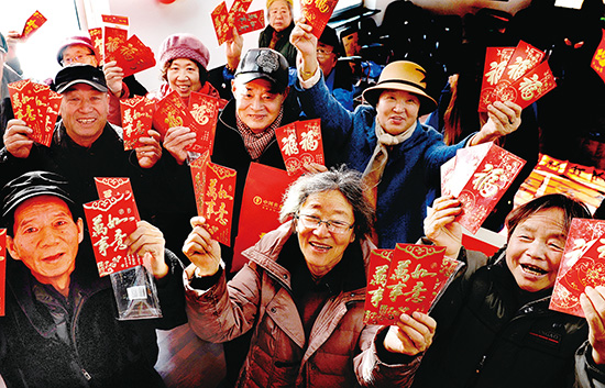 1월 19일, 진흥구 도철이구역사회 주민들이 기뻐하며 기자에게 도서무료열람권이 들어있는 빨간 봉투를 내보였다. 이날 주민들은 "쥐해맞이”민속문화현장에서사탕만들기, 설맞이주련쓰기, 창화(窗花, 중국민간전지예술의 일종) 자르기, 민속지식맞추기, 민속양걸춤 등 활동을 다양하게 진행했다. (기자 송영곤 촬영).