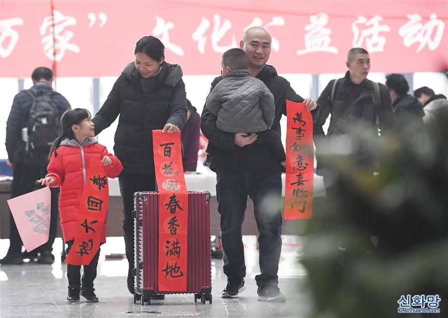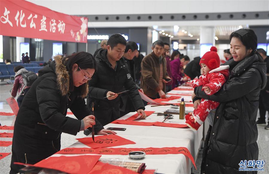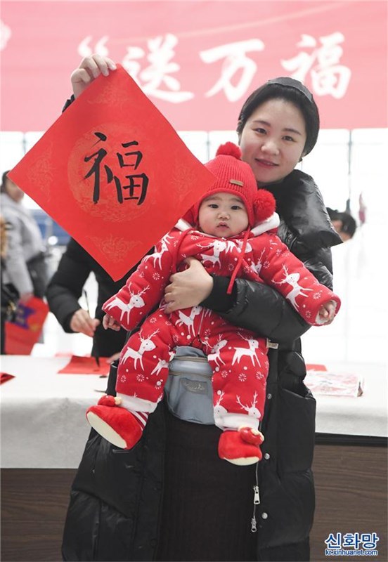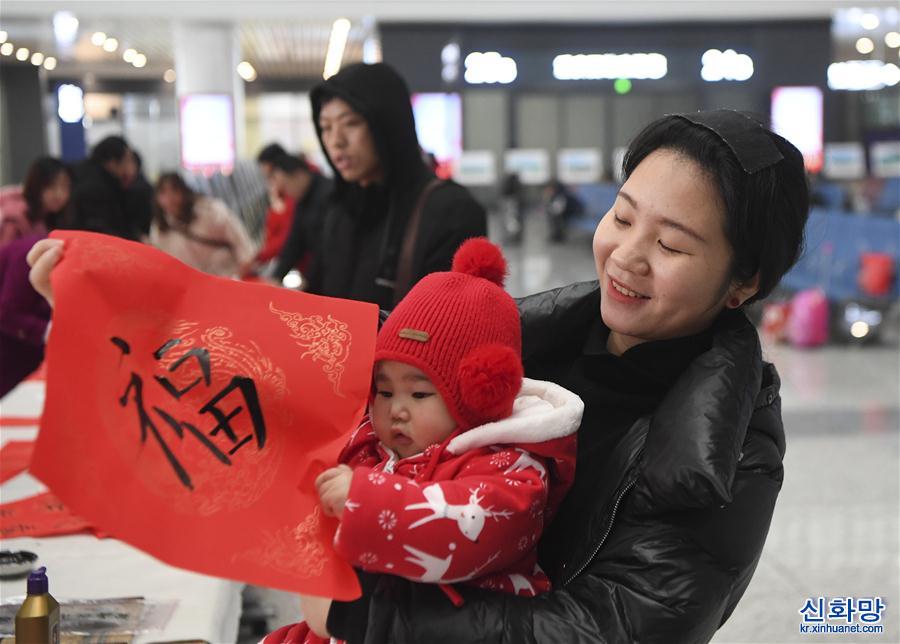 1월 20일, 여객이 충칭(重慶) 서역에서 복자(福字)와 춘련(春聯, 정월에 경사스런 말을 적어 문에 붙이는 대련)을 손에 쥐었다. 이날, 중국철도청두(成都)국그룹유한공사가 충칭 서역에서 ‘송만복(送萬福)·진만가(進萬家)’ 행사를 가져 여객들이 이 회사 서예 애호가가 쓴 춘련과 복자를 집에 가져가게 했다. 행사 현장에서 여객이 자기 손으로 춘련과 복자를 쓰도록 요청하기도 했다. [촬영/ 신화사 기자 왕취안차오(王全超)]