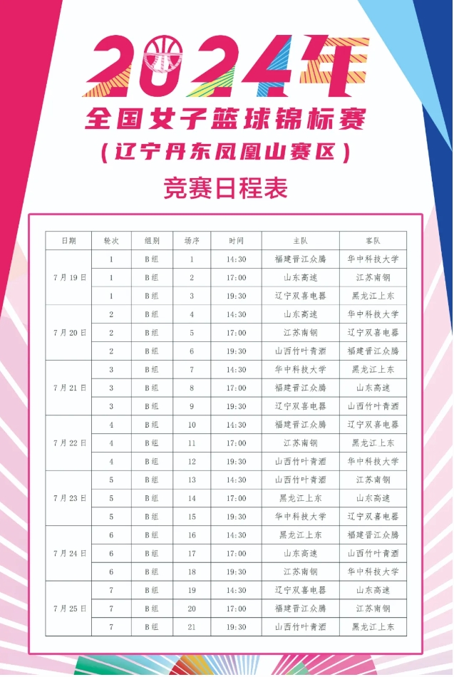 2024년 전국 녀자 농구 선수권 대회는 중국 농구 협회가 주최한 중국 녀자 농구 최고의 대회이다. 이번 단동 경기장은 7일 동안 진행되며 7개 팀이 참가한다. 개최지인 료녕쌍희전기 녀자 농구팀을 비롯해 흑룡강상동 녀자 농구팀, 복건진강 녀자 농구팀, 산서죽엽청주 녀자 농구팀, 산동고속 녀자 농구팀, 강소남강 녀자 농구팀, 화중과기대 녀자 농구팀이 단동에서 경기를 치른다. 매일 3경기가 진행될 예정이다.