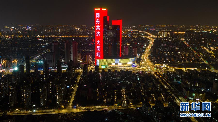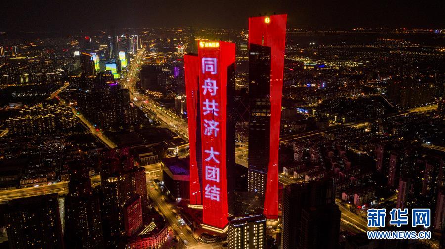 2월 2일, 남경시의 한 고층건물의 외립면에 "일심협력으로 단합하자"라는 표어가 나붙었다. (신화사 기자 리박 찍음).