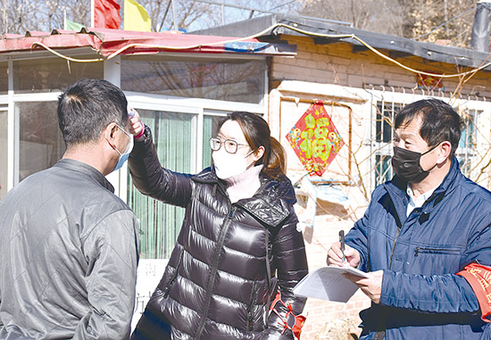 2월 5일 오전, 진안구 구련성진 전체직원들은 전염병 예방통제 최전선에서 굳게 지켰다. 사진은 요구촌 길목에서, 진촌 간부들이 출입인원에 대해 엄격한 등록과 체온을 측정하는 장면이다. (기자 류해동 찍음).