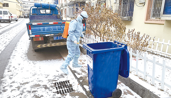 련일이래, 우리 시의 자원 봉사자들은 전염병 방호 현장 곳곳에서 봉사하고 있다. 2월 5일, 단동 란천 구조 자원봉사자들은 방호복차림으로 15kg의 소독병을 등에 메고 우리 시의 많은 오래된 아파트단지들을 소독했다. 사진은 자원봉사자들이 역전가도일가동네에서 의무 소독하고있는 장면이다. (기자 장요 찍음).