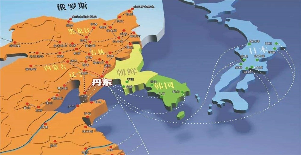 단동은 “3”연도시이다. 조선반도와 300킬로미터의 변경선을 가지고 있다. 단동 철도는 평양에서 220킬로미터 떨어져 있고, 서울에서 420킬로미터 떨어져 있다. 일본 시모노세키, 한국 서울, 조선 평양, 중국 북경과 러시아 모스크바를 잇는 유라시아 철도 대동맥의 중요한 구성부분이다.