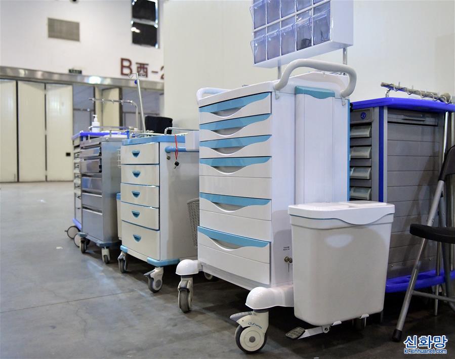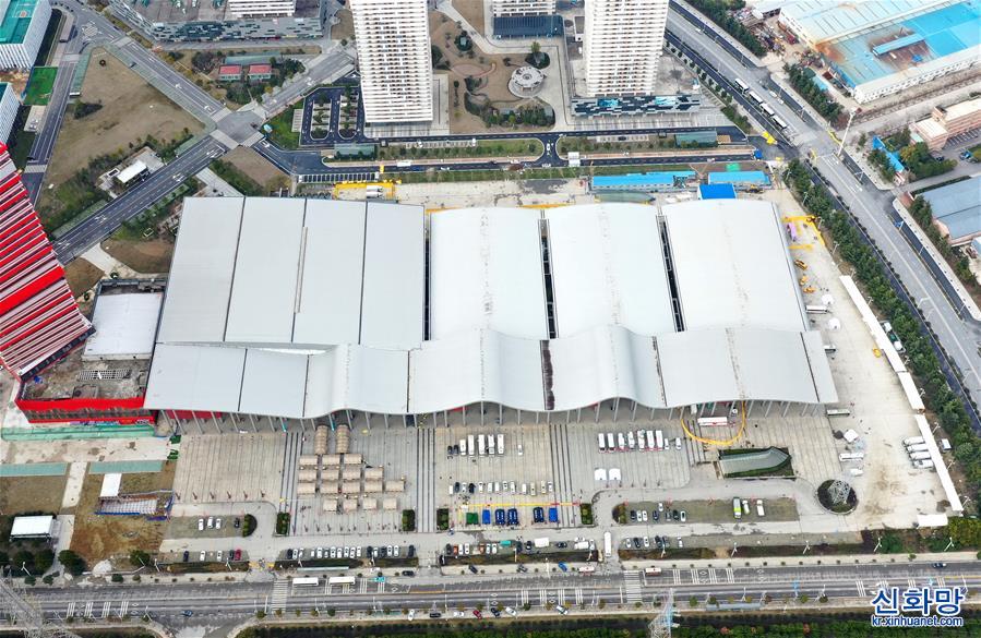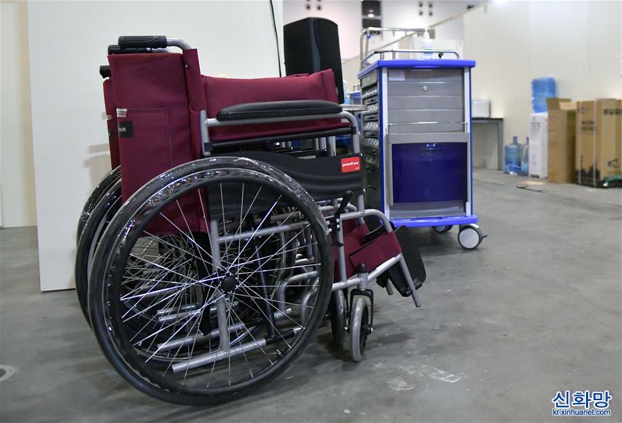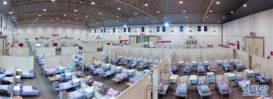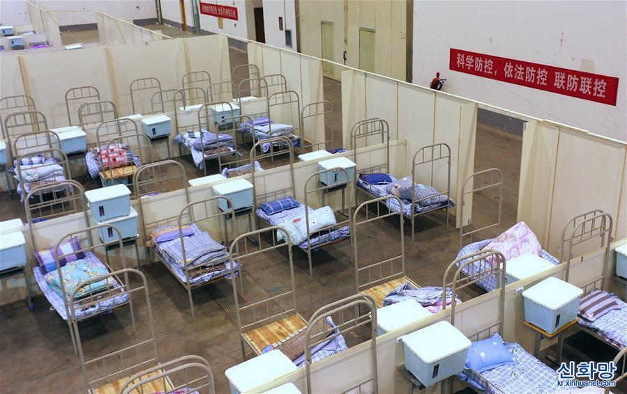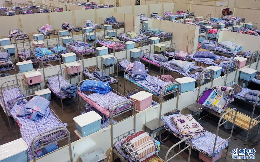 2월8일 공중에서 부감한 우한커팅(武漢客廳) ‘팡창병원(方艙醫院, 임시 간이병원)’ 전경(드론 촬영). 각 항 시설의 준비가 완료된 우한커팅 ‘팡창병원’ B구역이 이날 사용에 투입된다. 우한커팅 ‘팡창병원’은 신종 코로나바이러스 감염 폐렴 환자를 치료하기 위해 한 초대형 종합도시문화센터를 개조·건설한 것이며 침대 2,000개를 놓을 수 있다. 현재 ‘팡창병원’ A구역은 이미 사용에 투입되었다. [촬영/ 신화사 기자 리허(李賀)]