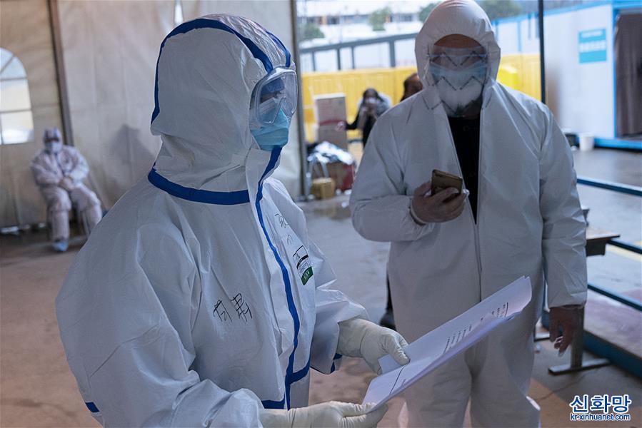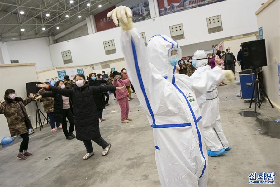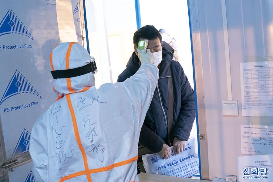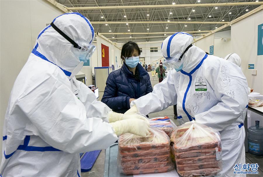 2월 10일, 한 환자가 우한커팅(武漢客廳) 팡창병원(方艙醫院, 임시 간이병원)에서 입원 수속을 밟고 있다. 우한 팡창병원이 2월 5일부터 첫 환자를 접수한 이래 질서있게 운영되고 있다. 환자들은 의료진의 알뜸한 보살핌에 몸조리하며 완쾌를 기다리고 있다. [촬영/ 신화사 기자 슝치(熊琦)]