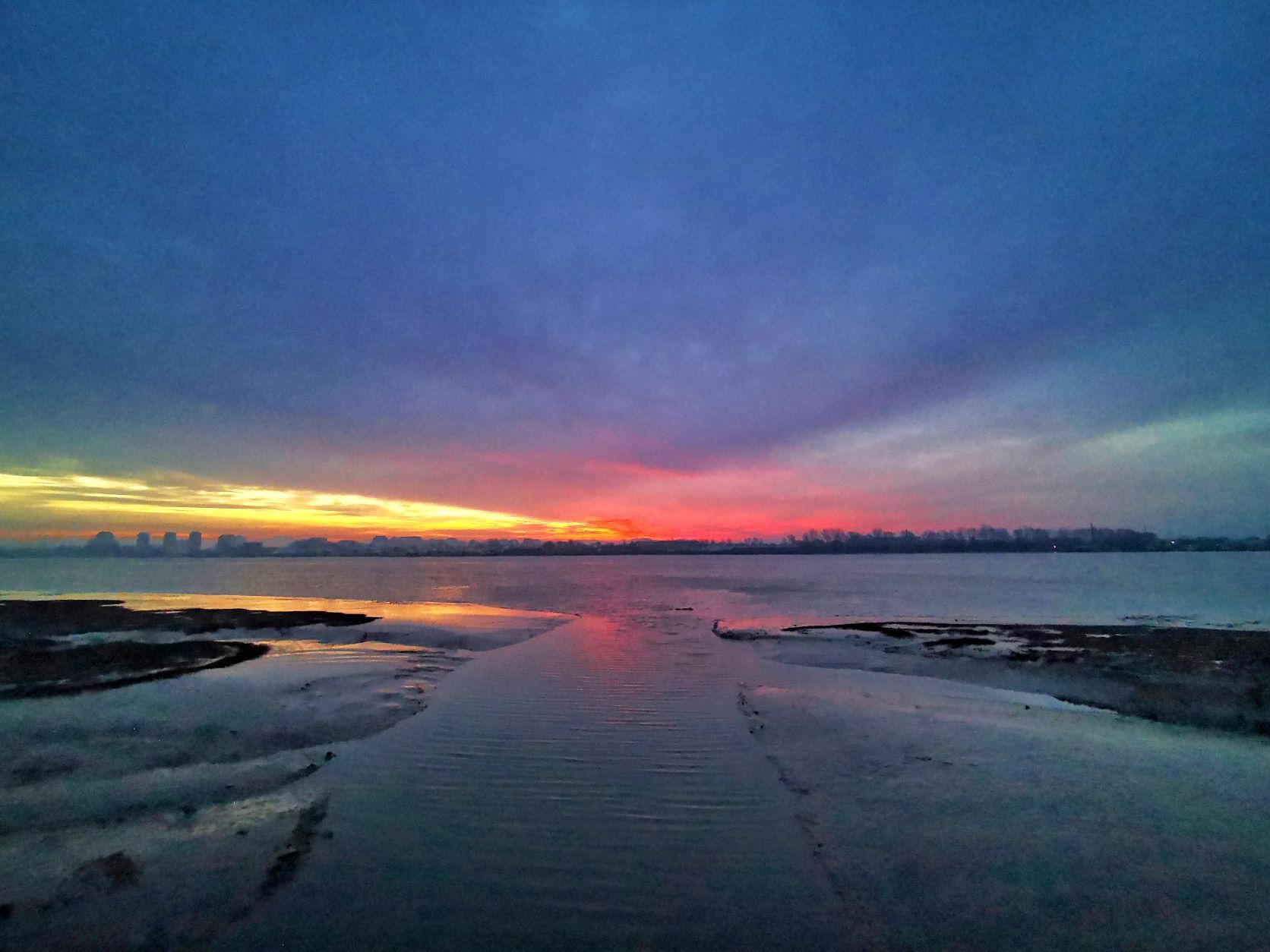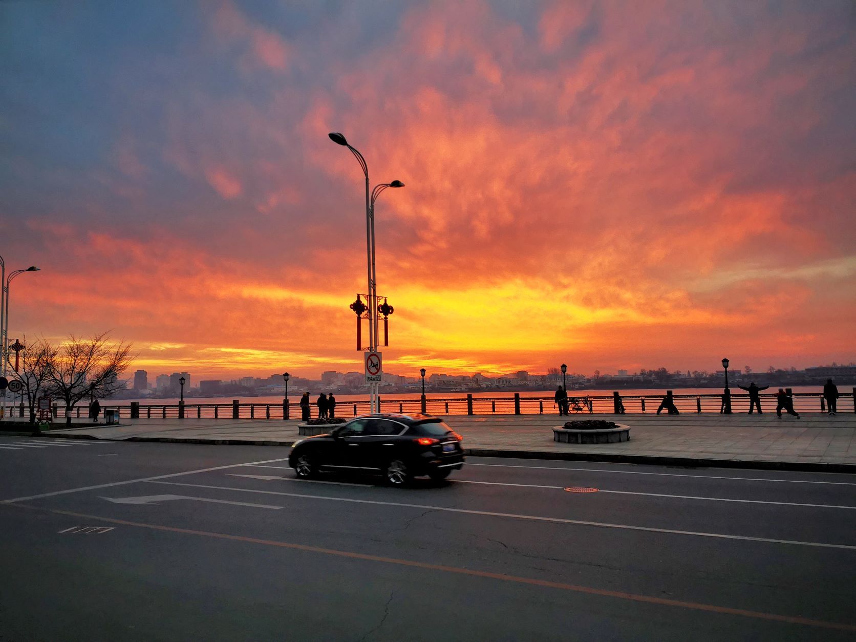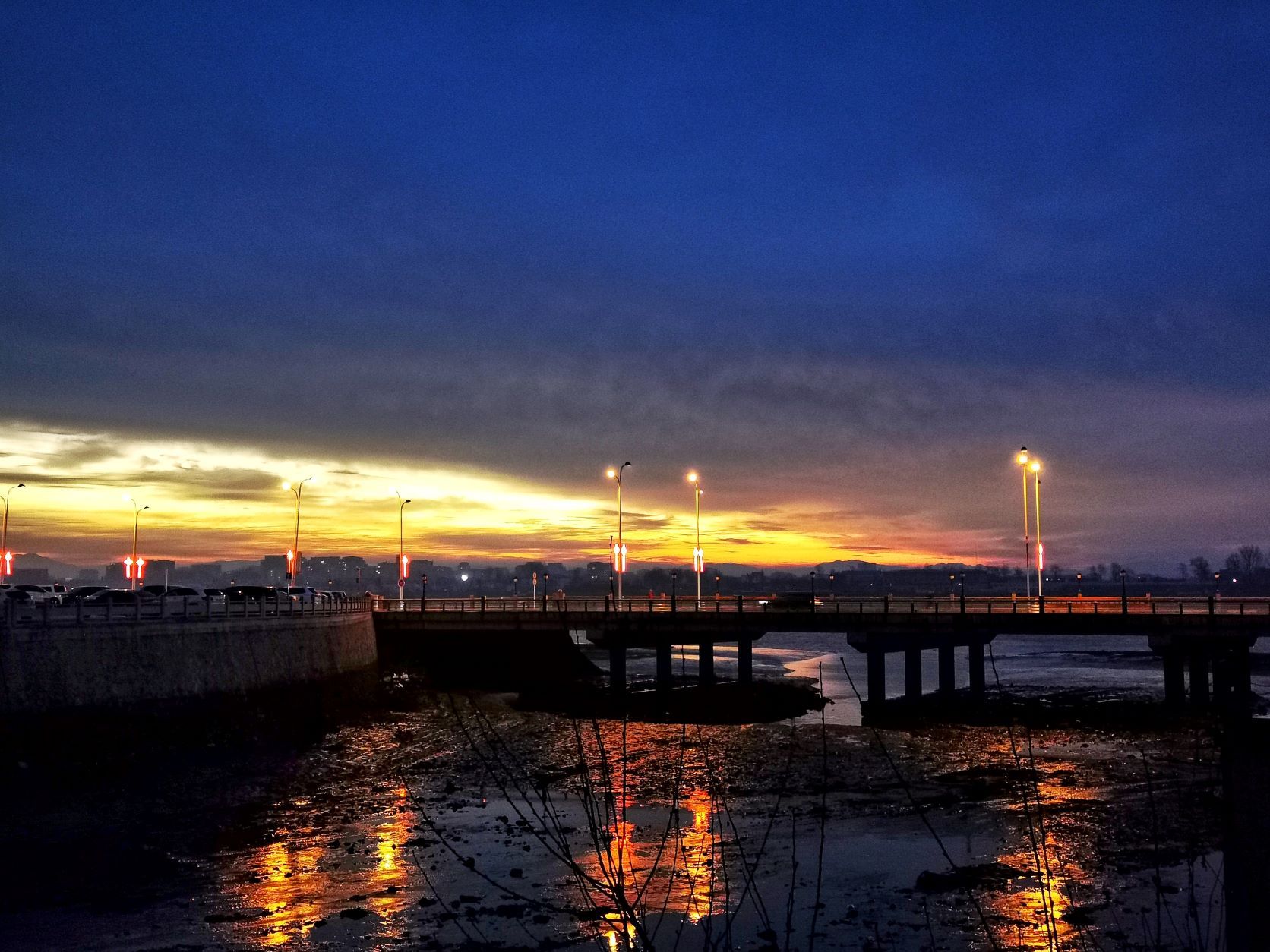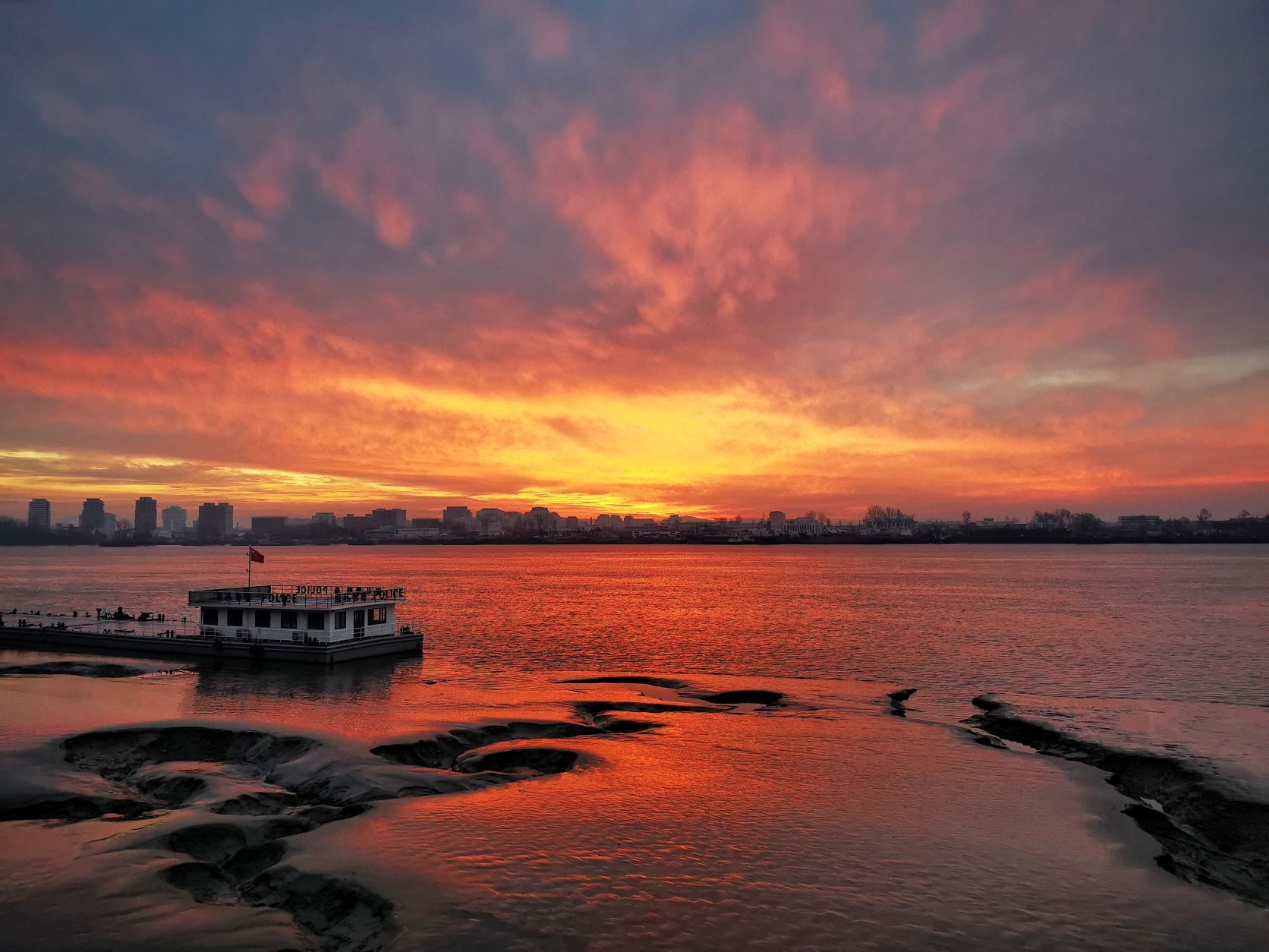 압록강변 짙은 구름 아래로 붉은 빛깔의 아름다운 새벽 햇살이 비추며 하늘을 붉게 물들였다.