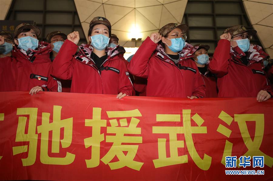 2월 12일 무한을 지원하는 의료팀 팀원들이 심양 도선공항에서 선서하고 있다. 이날 료녕성위생건강위원회는 115명의 의무일군을 파견하여 무한과 양양을 지원했다. 이 의료팀은 중국의과대학부속 성경병원을 주체로 설립됐는데 그중 32명이 무한으로 가고 이외 83명은 료녕성의 호북성 양양을 맞춤지원하는 첫번째 의료팀 성원들이다(신화사 기자 양청 촬영).