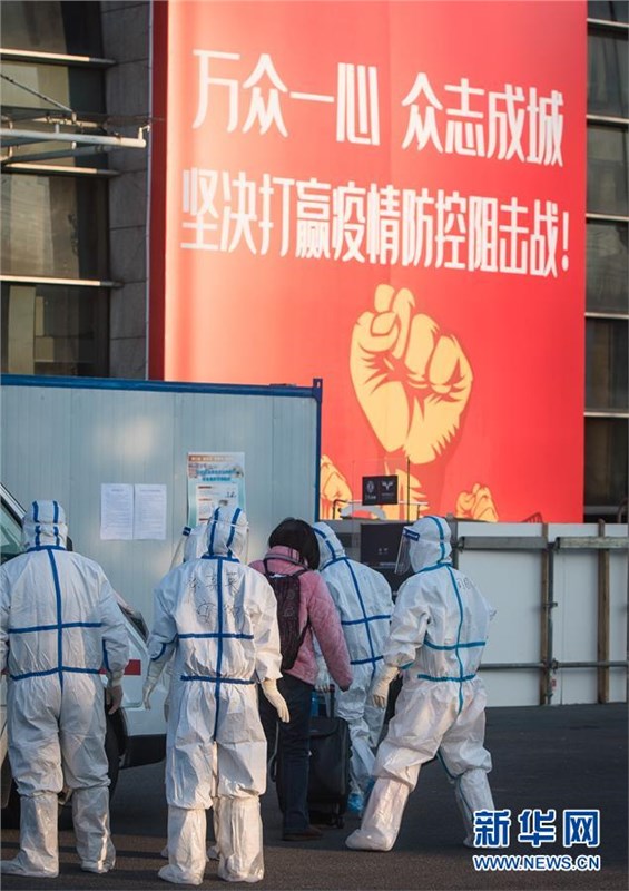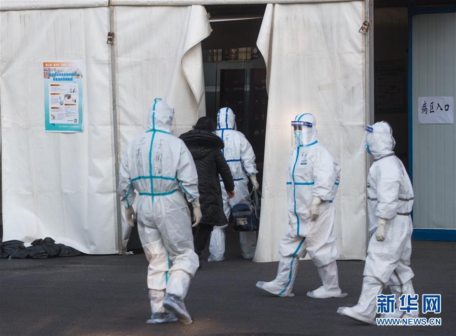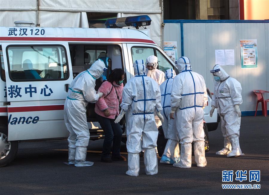 2월 12일, 의료인원이 환자를 무한체육센터 방창병원으로 이송하고 있다. 이날 오후, 무한체육센터에 위치한 방창병원이 정식으로 가동되였는 데 1100개의 의료 병상을 제공하여 신종코로나바이러스감염 페염 경증환자들을 접수하기 시작했다(신화사 기자 소예구 찍음).