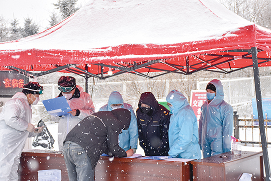 2월 15일, 교통 · 공안 · 검역 부문인원들이 고속도로 단동출구에서 눈을 무릅쓰고 차량 검측 · 등록 · 소독 · 체온검사 등 작업을 벌였다.(기자 류해동 찍음)