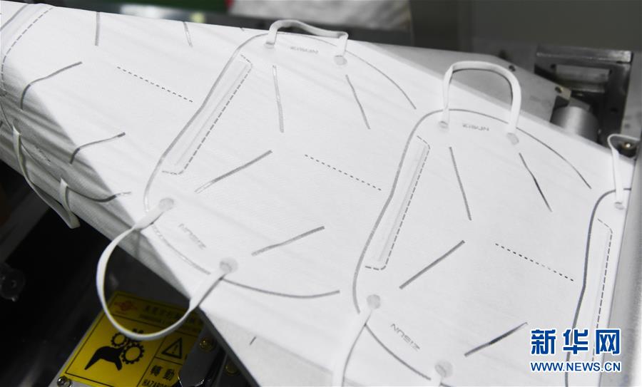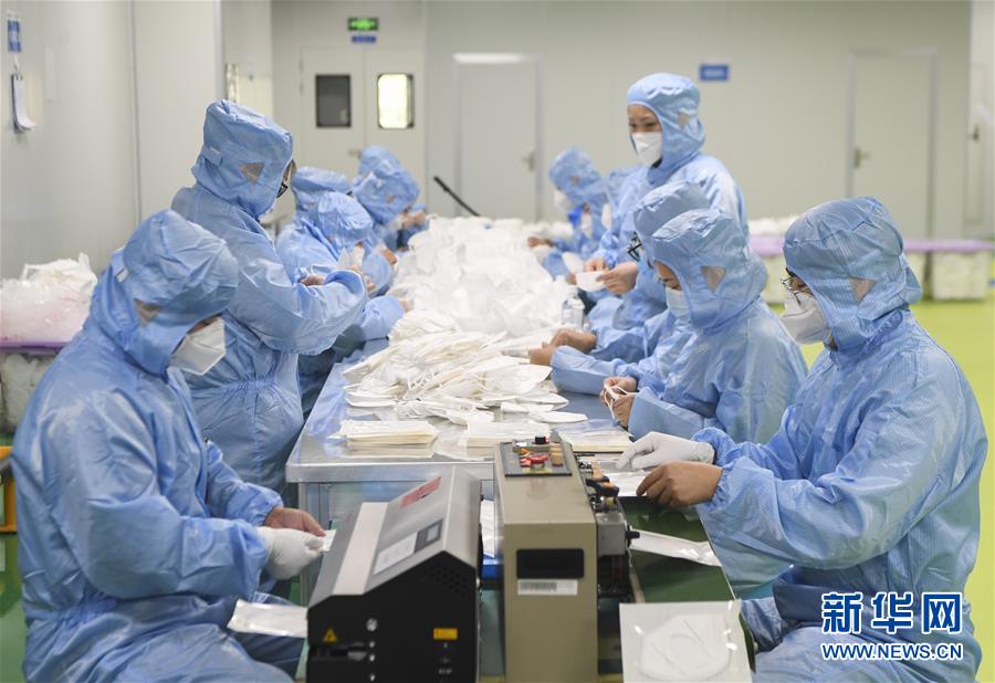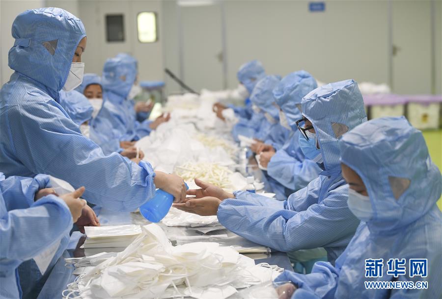 사진은 2월 17일 중경 한 기업의 생산포장작업장에 있는 N95의료용 방호마스크 생산라인의 모습이다. 중경시는 신종코로나바이러스감염 페염 전염병이 발생한 이래 관련 기업이 N95의료용 방호마스크의 연구개발, 생산을 확대하도록 적극적으로 인도했으며 최전선 의료진의 수요를 우선적으로 보장하고 전염병 예방통제을 위해 보장을 제공하고 있다(신화사 기자 왕전초 찍음).