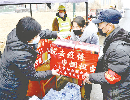근일,시부녀련합회는 의료용 장갑, 소독액, 스피커, 핫패치 등 방역물자와 생활용품을 진안구 구련성진 하서전자촌 방역지점에 보내 방역 제1선을 지키는 방역인원들을 위문했다. (기자 송영곤 찍음)