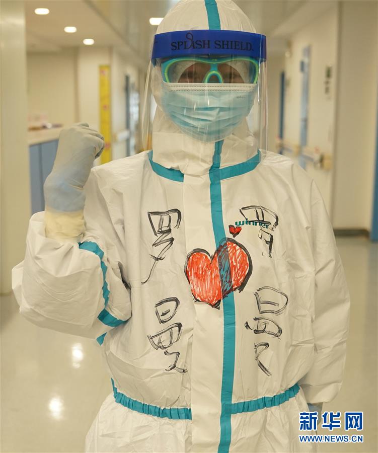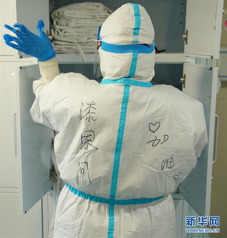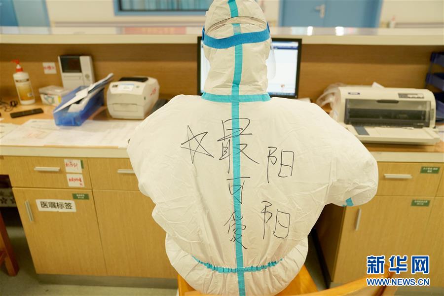 무한시 화중과학기술대학 동제의학원부속 동제병원 중법신성원구 C동 10동 신종 코로나바이러스감염 페염 중증환자 병동에는 약 60명에 달하는 간호사들이 근무하고 있다. ‘최고’, ‘힘내’, ‘전사’, ‘가장 아름다워(超美)’… 그들은 매일 1회용 방호복에 이름과 축복메시지를 적어 자신과 동료들을 격려하고 있다. 전염병상황에서 백의천사들은 침착하고 적극적이고 락관적인바 그들이야말로 가장 사랑스러운 사람들이다(신화사 기자 왕육국 찍음).