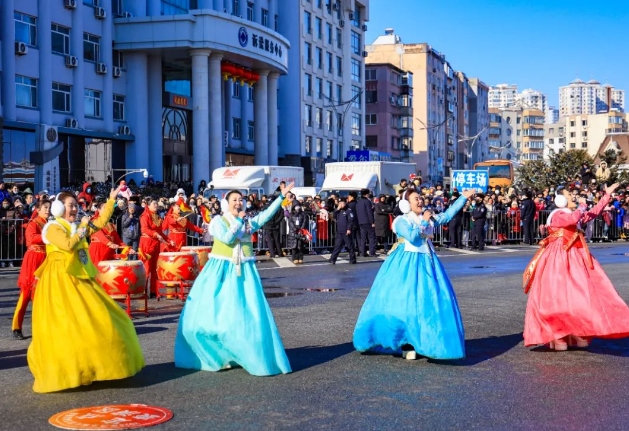 오후 1시, 행사는 격렬한 북소리와 조선족 녀성들의 노래와 춤으로 막을 올렸다.국가급 무형문화유산인 "단동 고악"이 첫 공개되자 관객들의 함성과 박수가 터져 나왔다. 각 양가 팀은 독특한 개성을 뽐냈다: 시 체육운동학교 팀은 물고기와 봉황 모양의 등불을 들고 길상을 상징하는 춤을 선보였고 동항시팀은 금빛 부채를 휘날리며 바다처럼 넓은 정서를 표현했다. 봉성시의 룡무 팀은 룡춤과 등불춤 등 전통 민속 공연으로 관객을 매료시켰으며 관전만족자치현팀은 쾌활한 노래에 맞춰 경쾌한 춤사위로 만족의 자부심을 드러냈다. 진안구와 진흥구 팀은 각각 고전과 현대적 요소를 결합해 옛 안동 시장의 다채로운 풍경과 줄타기 묘기 등을 재현했고 원보구 시베이 무용단은 “화하”를 통해 중화 청년의 빛나는 기상을 표현했다.