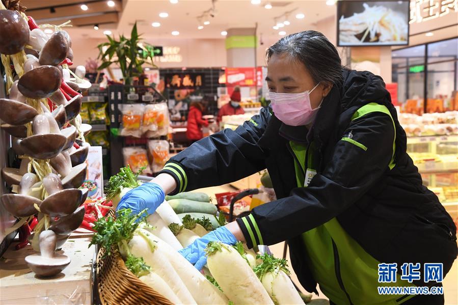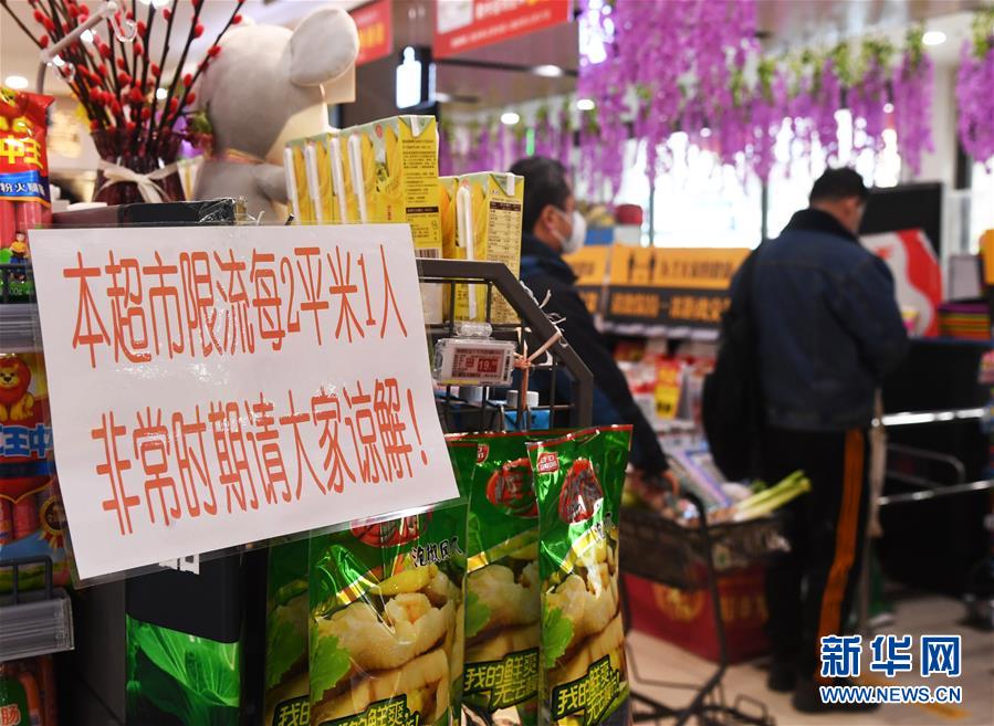2월 26일, 해정구 중관촌거리가도에 위치한 CSF마켓 과학성가게에서 고객들이 결제하고 있다. 신종코로나페염 전염병이 발생한 이래 북경시 해정구 중관촌가도의 각 슈퍼마켓은 위생방역을 잘하는 동시에 '1 메터 라인' 설치, 안내문 부착, 입장 고객의 체온측정 등 방식을 통해 슈퍼마켓의 쇼핑환경 관리를 강화하여 고객의 쇼핑안전을 보장하고 있다(신화사 기자 임초 찍음).