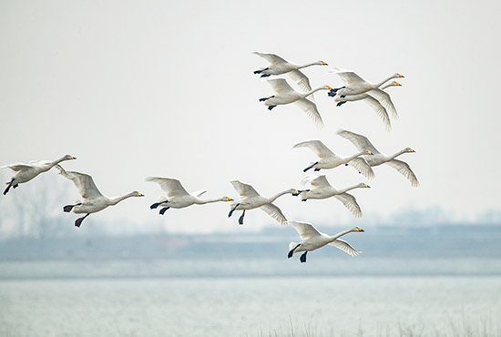 3월 1일, 동항 합륭저수지, 한 무리의 백조떼가 수면 위를 날아들고 있다.