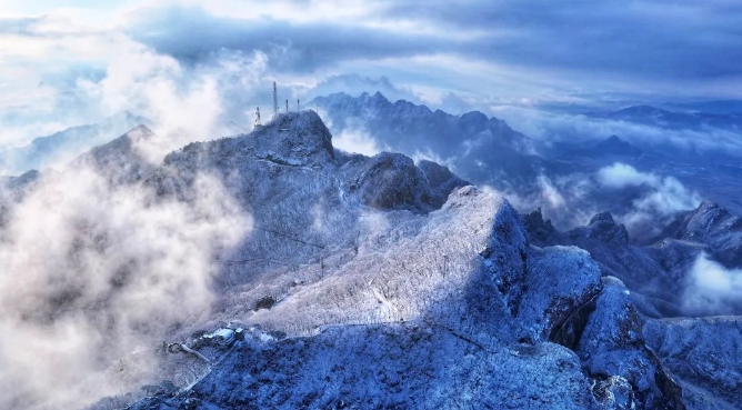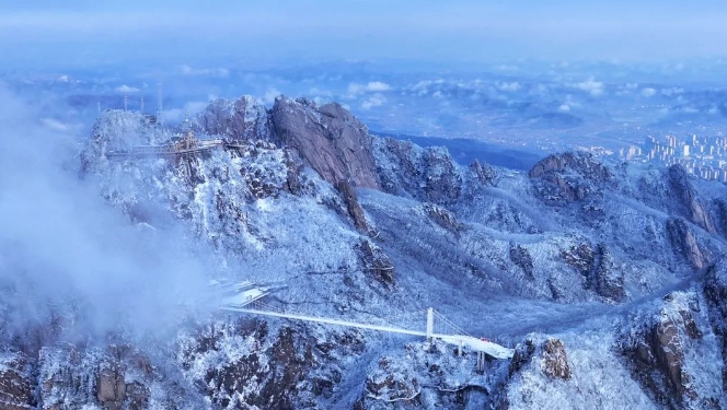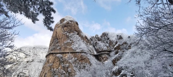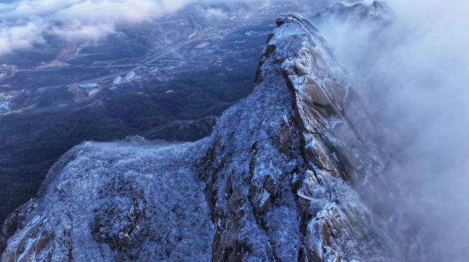 해발 836m의 봉황산 주봉이 마치 백옥으로 조각된 거대 탑처럼 우뚝 서고 산중의 소나무와 측백나무는 수만개의 얼음 칼날로 변해 진달래 개화 시즌에 뜻밖의 "눈꽃 만발" 서리꽃 기적을 연출했다.