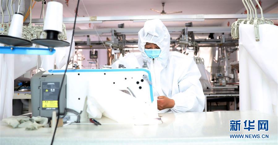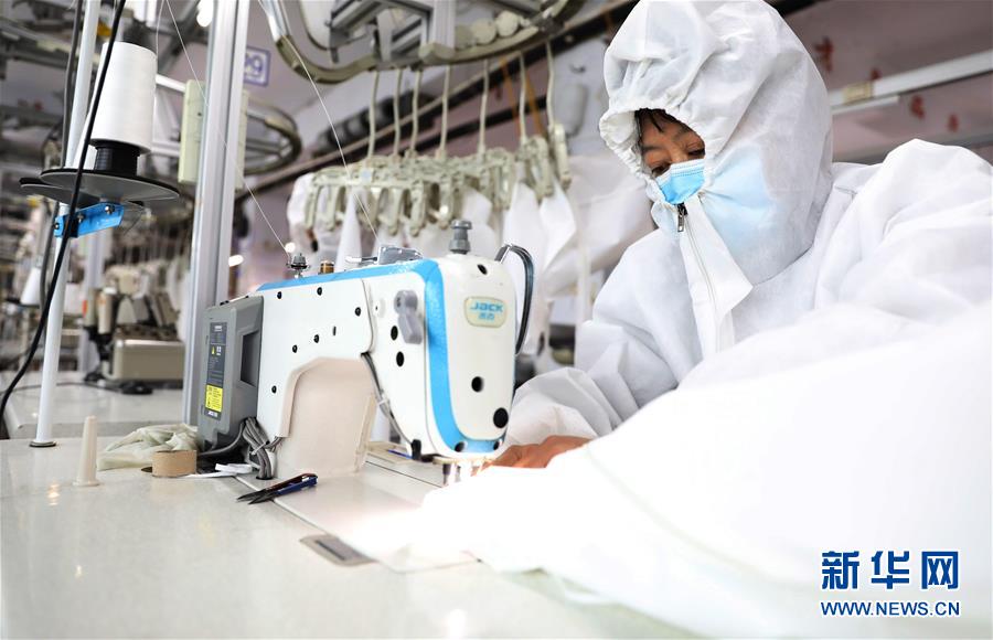 3월 3일, 료녕 융모의류유한회사에서 로동자들이 생산직장에서 의료용 격리복을 만들고 있다.