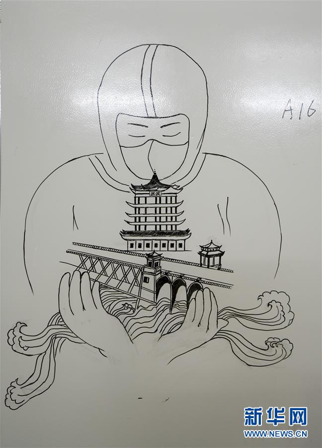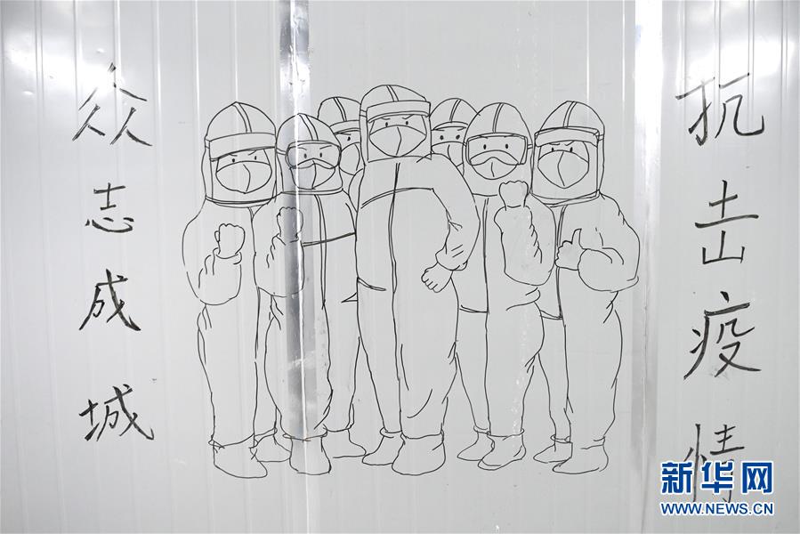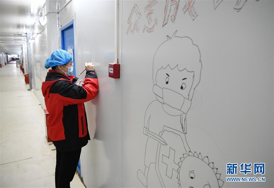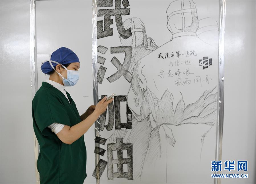3월 4일, 무한제1병원에서 온 진아리가 무한 뢰신산병원 ‘예술장랑’에 그려진 동료들의 그림을 촬영하고 있다. 뢰신산병원이 건설된 후 각지의 의료진이 이곳에 진주하여 전력을 다해 환자를 치료하고 있다. 뢰신산병원 복도의 벽은 의료진과 직원들이 그림과 글로써 자신의 감수를 표달하는 창구가 되였다. 따뜻한 필치, 힘찬 화필로 아름다운 축복을 담았으며 전염병과 싸워 이기려는 그들의 신념과 결심을 보여주고 있다(신화사 기자 정민 찍음).