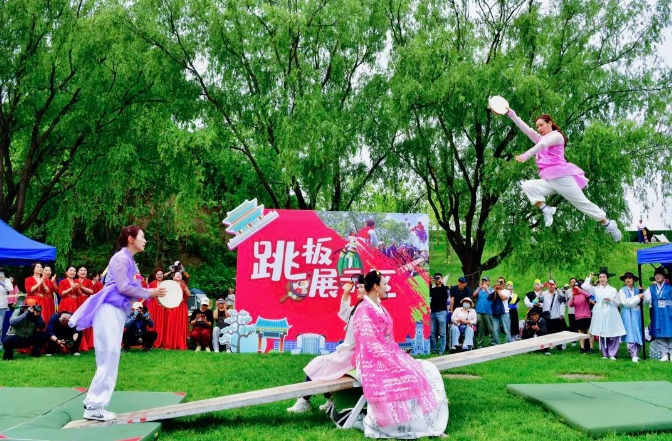 민속게임코너에서는 ‘널뛰기’와 ‘그네뛰기’가 시민과 관광객들의 관심을 끌었다. 연변대학교 체육학원의 국가급 선수들이 화려한 의상을 입고 리듬에 맞춰 공중제비, 도약 등 아름다운 동작을 선보이며 관객들의 탄성과 환호를 끌어냈다.