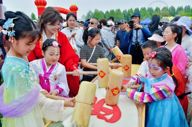 곧 다가올 대학입시와 단오절을 맞아 많은 관광객들이 ‘복망치’를 들고 떡메치기에 참여하며 “떡으로 높은 점수를 치다(打‘糕’分)”는 말과“한번에 대학교에 합격하다(一举‘糕粽’)”는 의미의 길조를 빌었다. 심양에서 온 장씨는 “오늘 정말 맛있는 음식을 많이 먹었고, 아이에게도 가져다주려고 샀다”며 “이번에 단동에 단오련휴를 보내러 왔는데 조선족민속유원회가 때마침 열려 공연도 보고 음식도 맛보며 뜻밖의 즐거움을 누렸다”고 전했다.