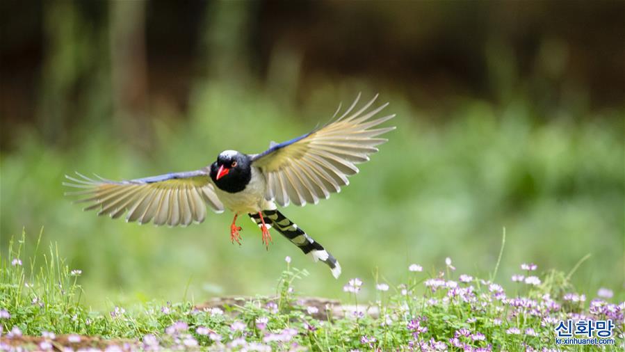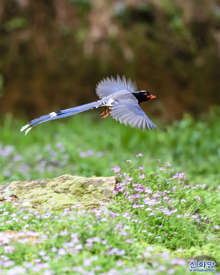 3월22일, 푸젠성 밍시현 샤팡향 중시촌에서 붉은주둥이 파란까치가 자운영 꽃바다 위를 날고 있다. [촬영/신화사 기자 메이융춘(梅永存)]