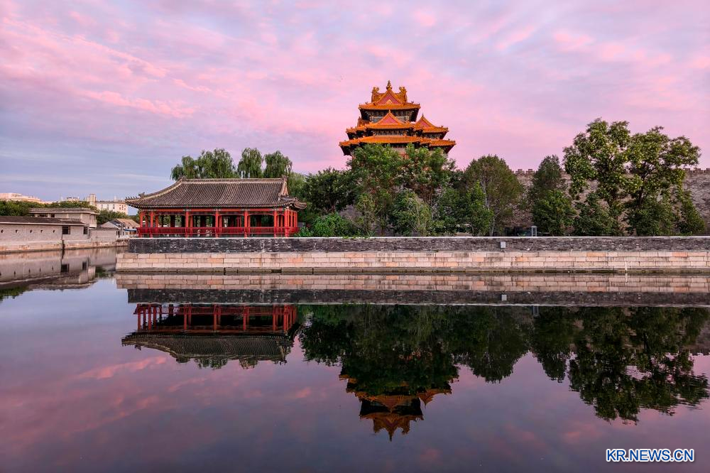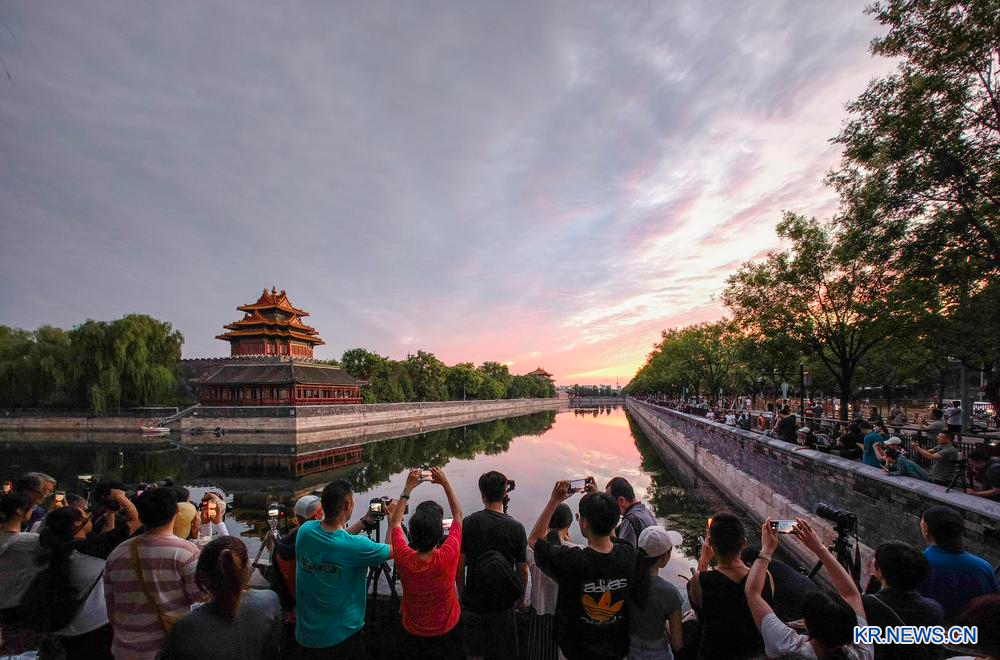 이날 저녁, 노을을 배경으로 한 북경고궁 동북각루의 모습을 휴대전화에 담는 시민들의 모습이 눈길을 끌었다. 2025.7.20