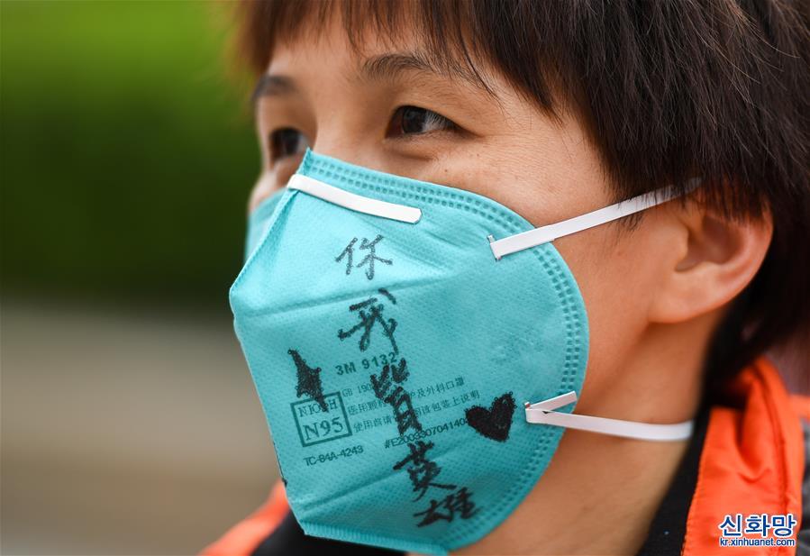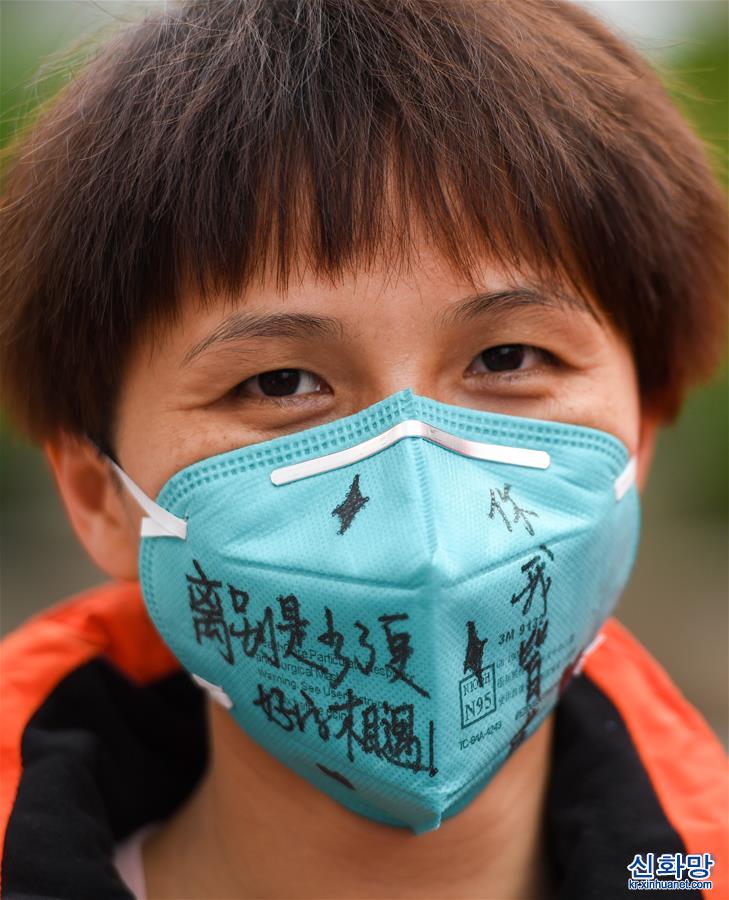 3월 23일, 광둥(廣東) 제14차 후베이 지원 의료팀 대원, 광둥 포산(佛山)시 난하이(南海)구 여성어린이보건원의 장추핑(張秋萍)이 마스크에 작별 메시지를 적었다. 광둥 제14차 후베이 신종 코로나바이러스 감염증(코로나19) 방역 지원 의료팀이 각 항 임무를 순조롭게 완성하고 이날 우한에서 광둥으로 돌아갔다. [촬영/ 신화사 기자 천예화(陳曄華)]