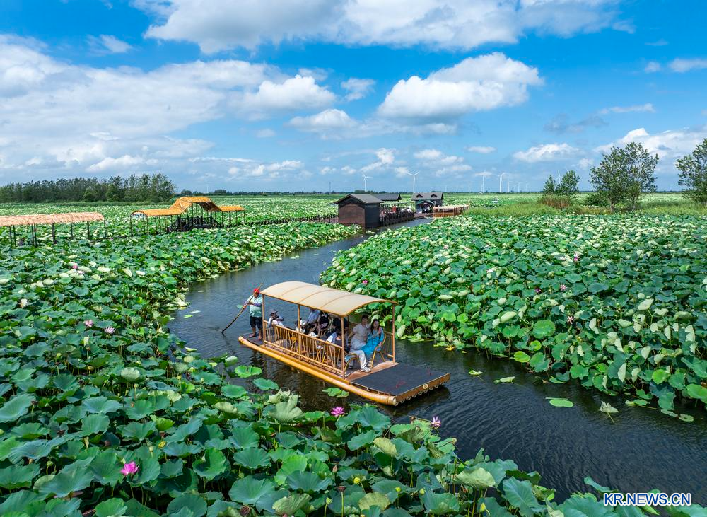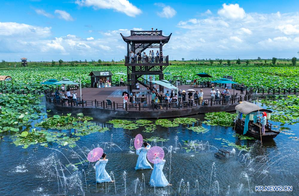 26일 강소성 흥화시의 한 연못관광지에서 유람을 즐기고 있는 관광객들의 모습을 드론으로 촬영하였다.또한 같은 날, 관광객들이 연못가 공연을 관람하는 장면도 드론에 담겼다.