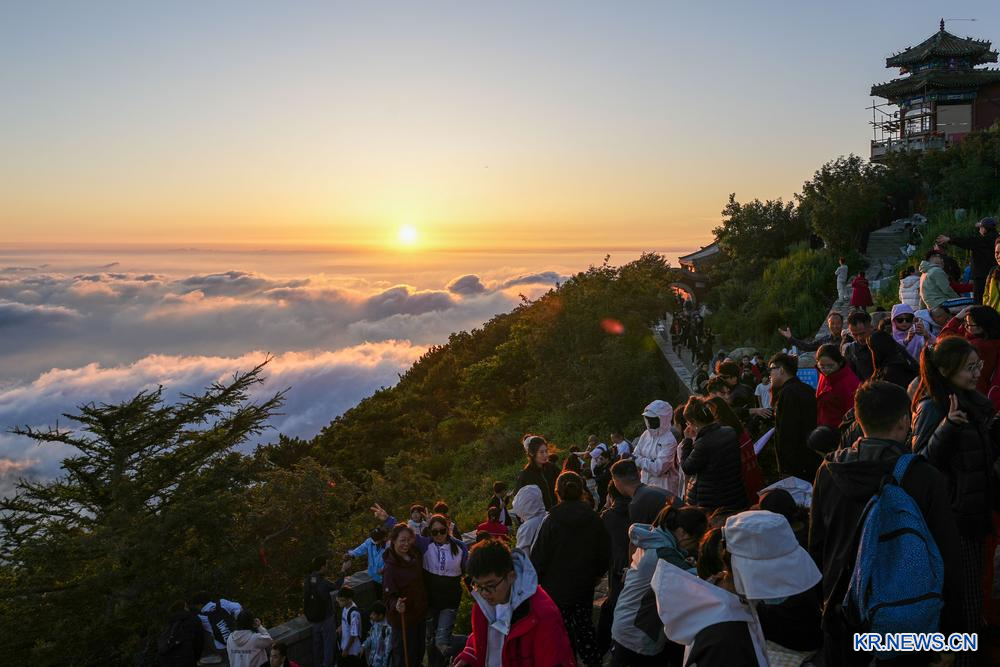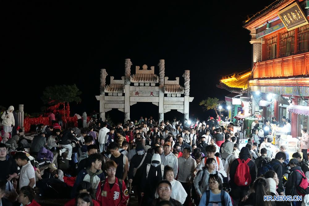 7월 31일, 태산관광지 천가를 가득 메운 관광객들의 모습이 포착되였다.같은 날, 관광객들은 일관봉에서 해돋이를 감상하며 여름철의 정취를 만끽하였다.