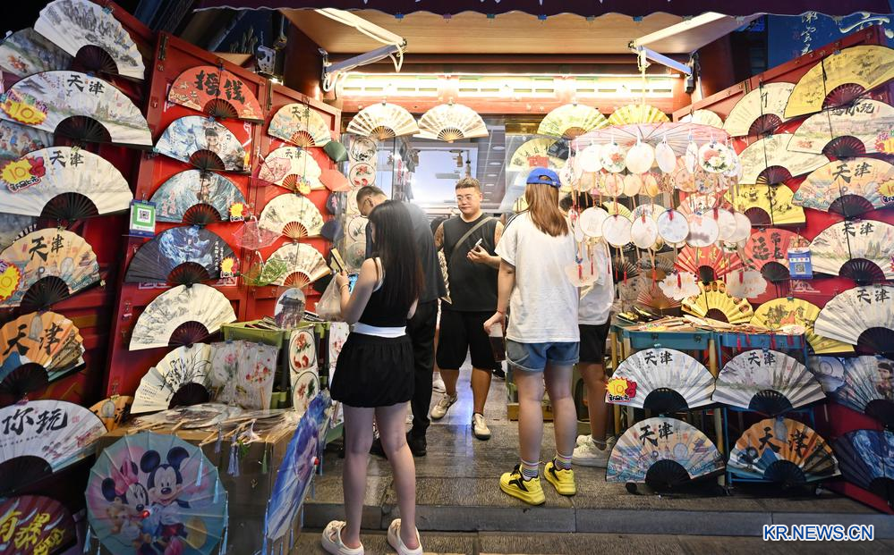 【신화통신 천진 8월 5일발】 3일 중국 천진에 위치한 고문화거리에서 문화창작상품을 고르는 관광자.