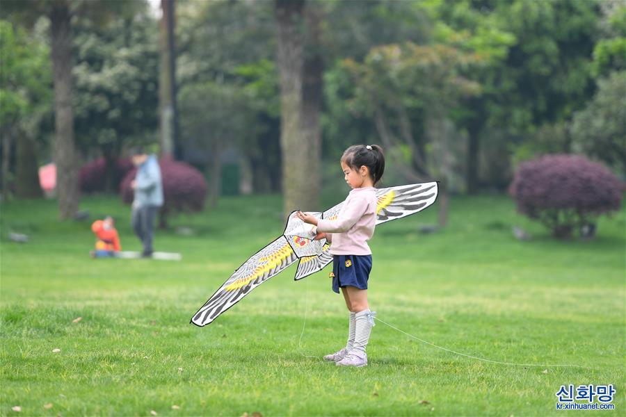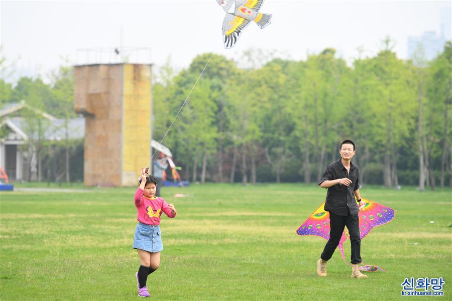 4월6일, 창사 쥐쯔저우 관광지에서 어린이들이 연을 날리고 있다. 청명절 연휴 마지막 날인 6일 시민들이 후난 창사 쥐쯔저우 관광지에서 풀밭을 거닐며 봄을 만끽하고 있다. [촬영/신화사 기자 천쩌궈(陳澤國)]