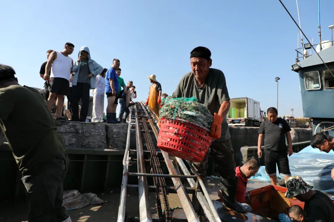“지금 잡히는 것은 주로 꽃게이며 일부 잡어들도 있습니다. 오늘 우리 두척의 배에서 4만㎏이 넘는 꽃게를 싣고 돌아왔습니다.”라고 선주 백문욱은 말했다. “배가 부두에 닿기도 전에 꽃게는 벌써 손님들에게 다 예약되였습니다. 열여집이 넘는 거래고객들이 기다리고 있습니다.”