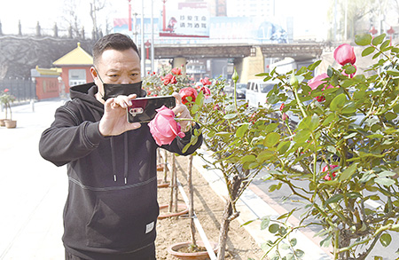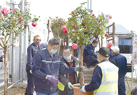 4월 15일 아침부터 압록강공원 사업일군이 빈강로에 월계화를 심고있다.
