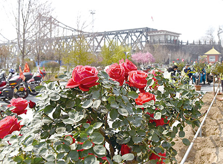 압록강공원 사업일군의 소개에 따르면 다리에서부터 12호 댐 문 구간까지 435 그루의 월계화를 심었는데 압록강 강반에 아름다운 풍경선으로 되고있다. (기자 오경 찍음).