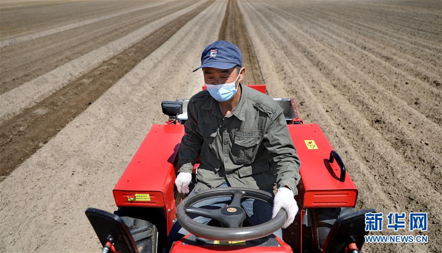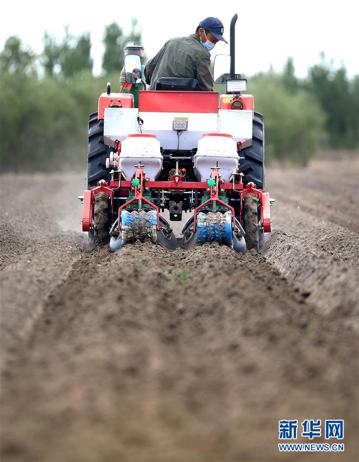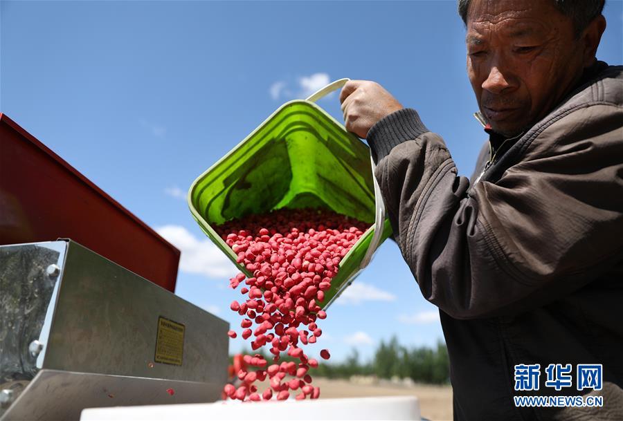 5월 12일, 대안현 홍가농목장의 한 로동자가 농기계에 땅콩씨앗을 투입하고 있다. 기온이 상승하고 토양의 습도가 알맞춤해짐에 따라 료녕성 안산시 대안현은 농사철을 틀어쥐고 대면적의 땅콩 파종을 시작했는데 전야는 한창 바쁜 모습이였다(신화사 기자 요검봉 촬영).