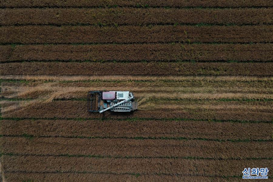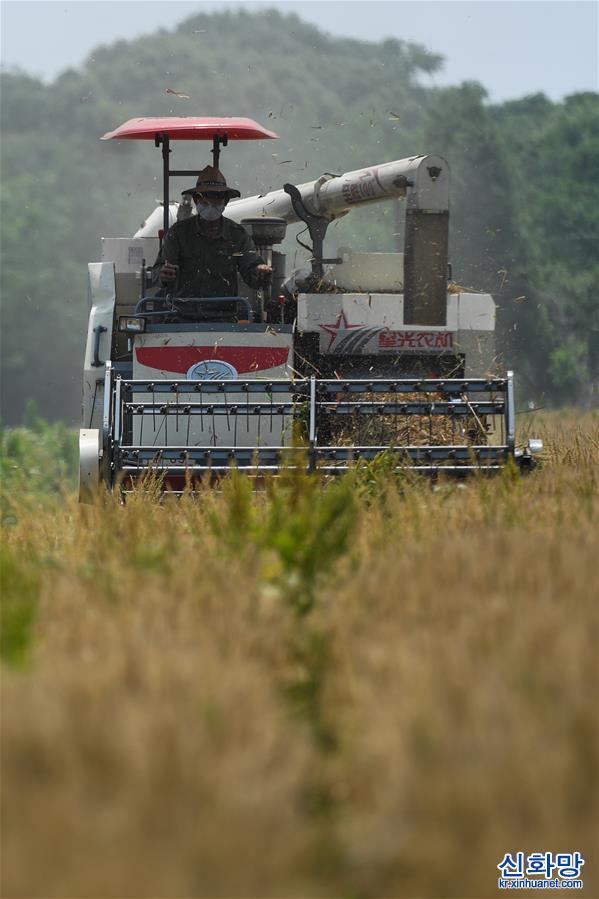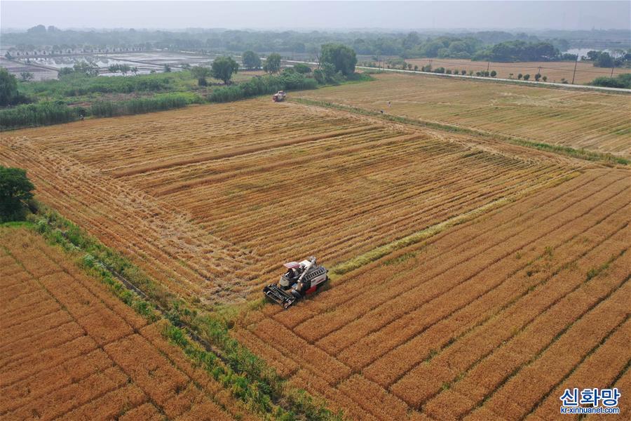 5월24일, 저장성 후저우(湖州)시 우싱(吳興)구 바리뎬(八里店)진 소재 한 전문 합작사의 보리밭에서 농민이 콤바인으로 보리를 수확하고 있다. (드론 사진)[촬영/신화사 기자 황쭝쯔(黃宗治)]