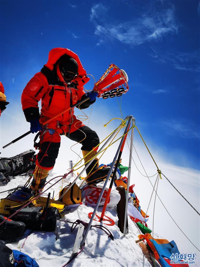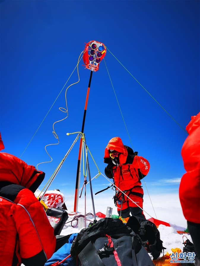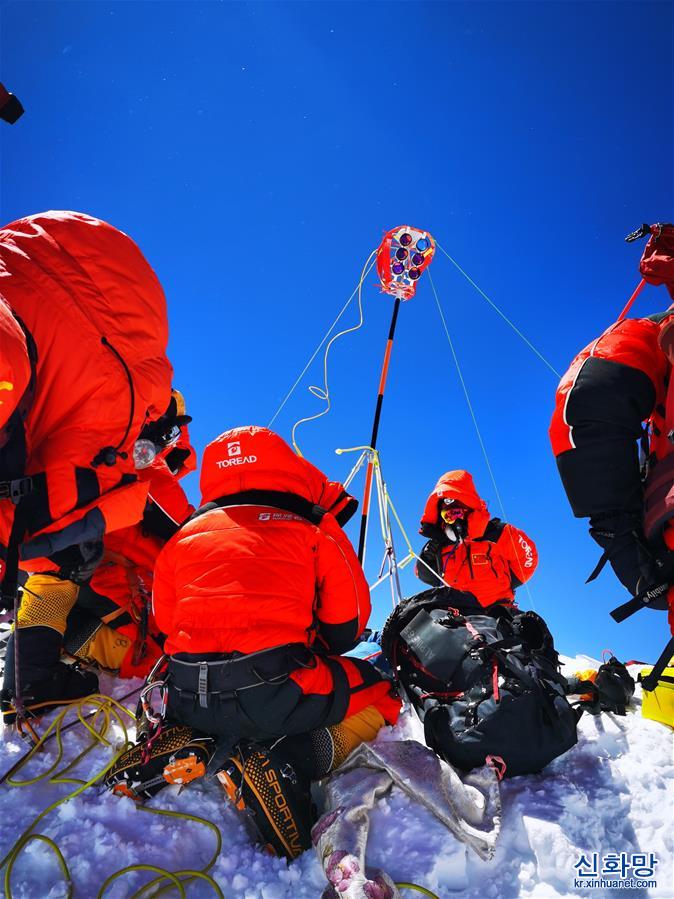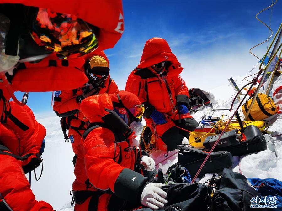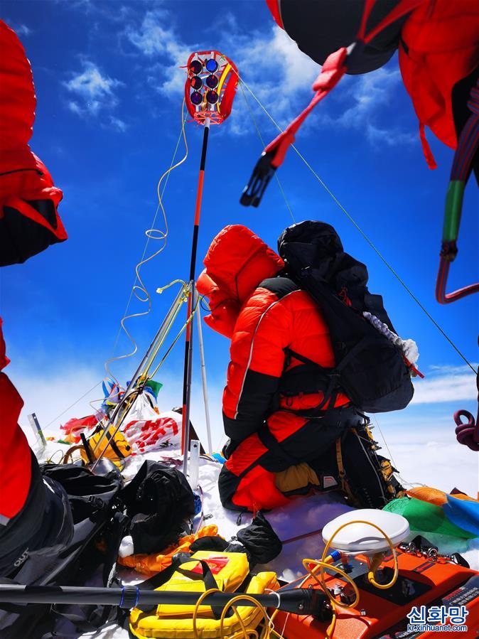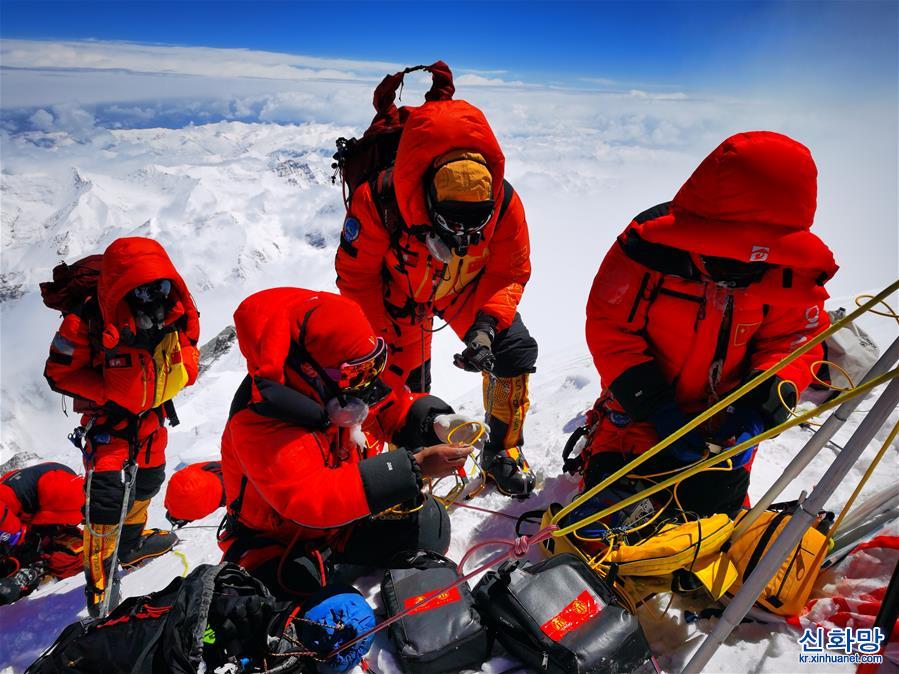 27일, 2020년 주무랑마봉(珠穆朗瑪峰) 고도 측정 등산대가 성공리에 세계 최고봉 주무랑마봉 정상에 올랐다. 이들은 정상에서 측량표와 GNSS 안테나를 설치하고 각 항 정상 측량 작업을 실시할 예정이다. 45년 전의 오늘, 중국인이 처음으로 측량표를 주무랑마봉 정상에 가지고 올라갔다. [촬영/신화사 기자 짜시츠런(扎西次仁)]