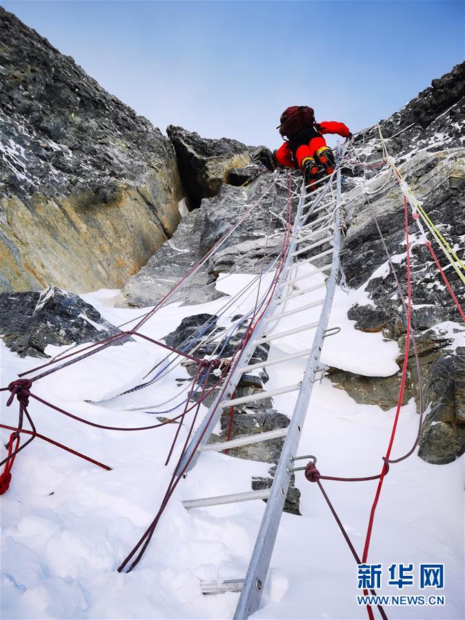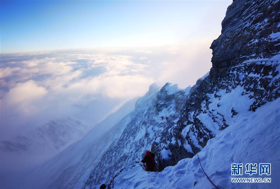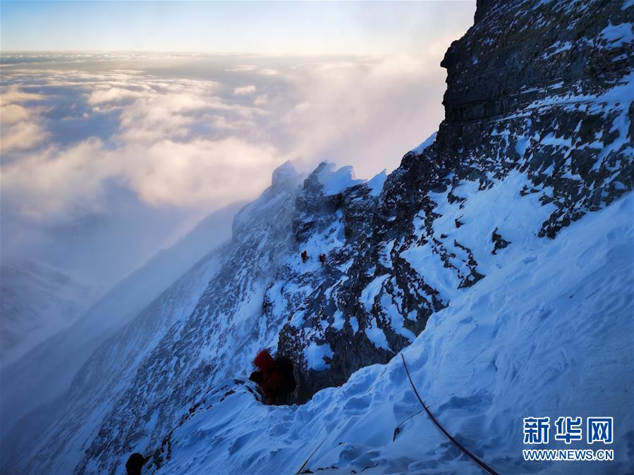 5월 27일, 2020 쵸몰랑마봉해발측량등산팀이 쵸몰랑마봉 정상을 향해 나아가고 있다. 이날 2시 10분경, 2020쵸몰랑마봉해발측량등산팀 대원 8명이 해발 8300메터의 돌격캠프에서 출발해 세계에서 해발이 가장 높은 쵸몰랑마봉 정상을 향해 전진했다(신화사 특약기자 자시츠런 촬영).