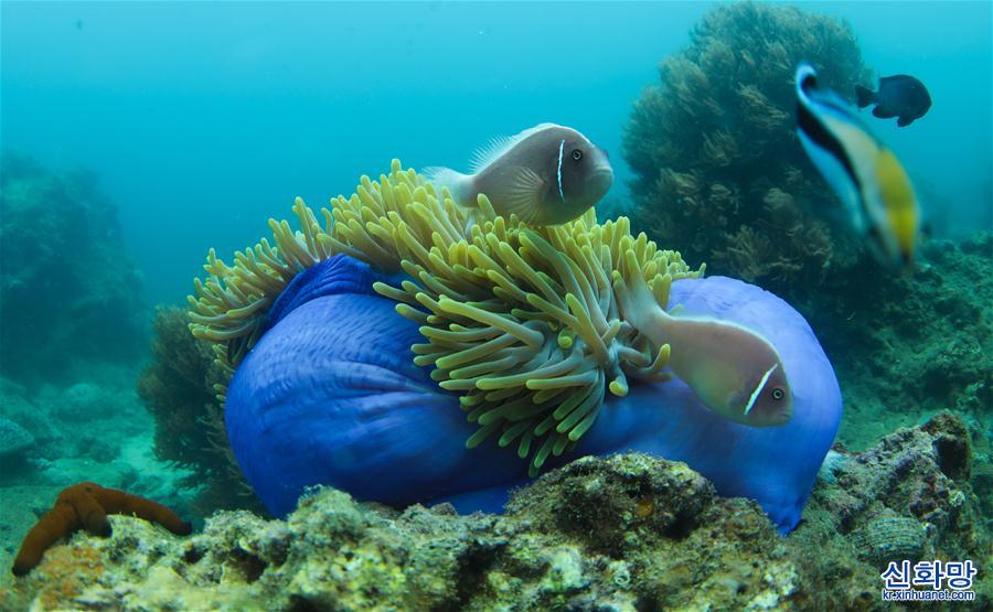 말미잘과 공생하는 흰동가리. 5월28일 하이난 싼야 우즈저우다오(蜈支洲島) 해역에서 촬영.