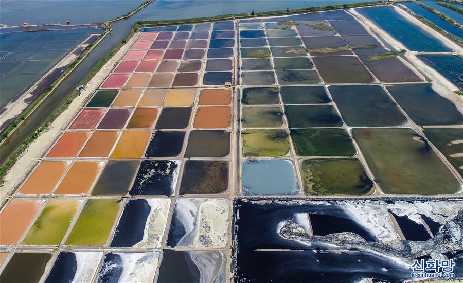 염전의 물이 고온에서 끊임없이 증발하면서 농도가 진해져 다채로운 색채의 독특한 경치를 연출하는 모습은 거대한 팔레트 같다. [촬영/리신쥔(李信君)]