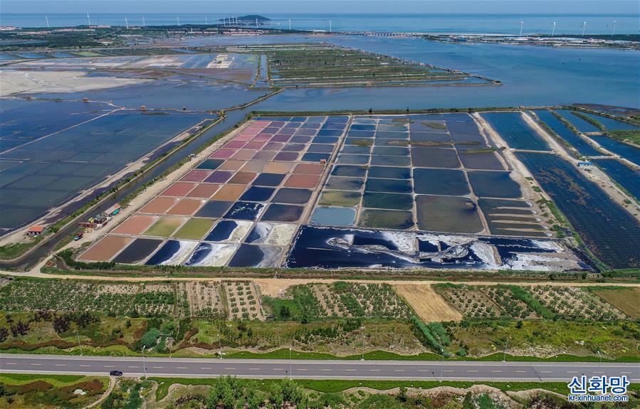 6월15일 산둥성 룽청(榮成)시 강시(港西)진의 한 염전(드론 사진)