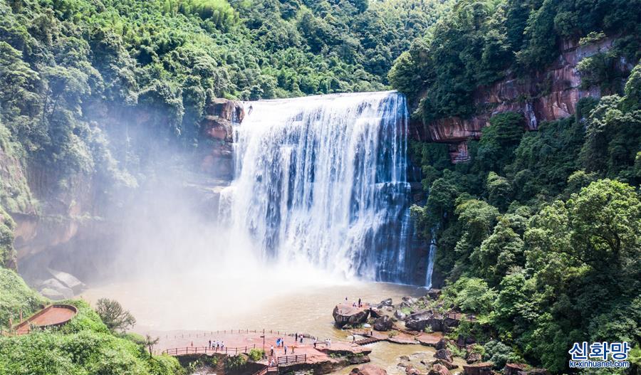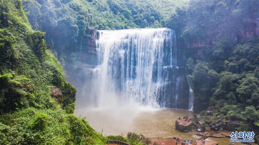 6월 15일, 유람객이 츠수이(赤水)대폭포관광구에서 유람하고 있다. 6월 15일, 날씨가 화창하고 폭포 수량이 풍부한 구이저우(貴州)성 츠수이(赤水)시 츠수이대폭포관광구에 많은 유람객이 찾아와 즐거운 시간을 보냈다. [촬영/ 신화사 기자 타오량(陶亮)]